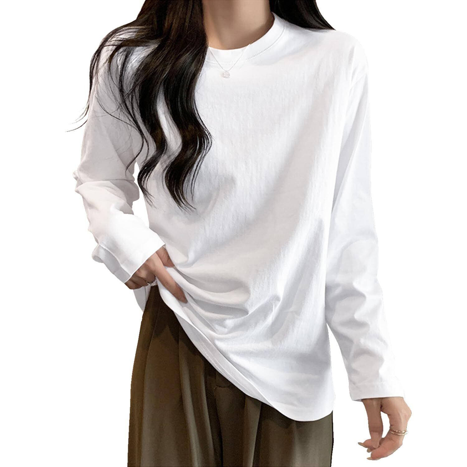 [Trnvco] 長袖tシャツ レディース【8.11オンス 綿100%】丸首 トップス オーバーサイズ 着痩せ カットソー 無地 クルーネック インナーシャツ 重ね着 ロングt ゆったり 部屋着 体型カバー 白 黒 グレー