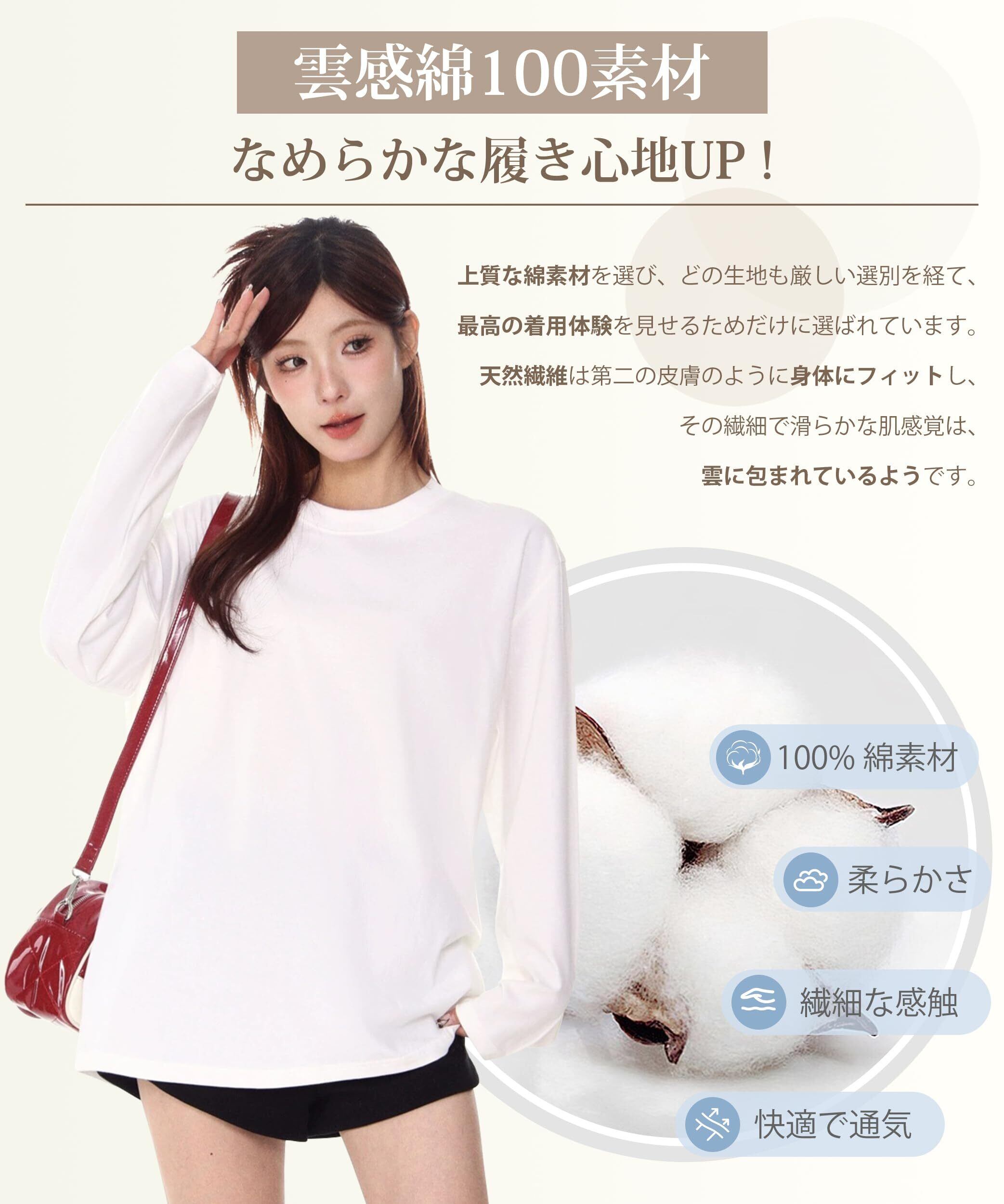 【なめらかな履き心地雲感綿100素材】 この長袖tシャツ レディースは上質な綿素材を選び、どの生地も厳しい選別を経て、最高の着用体験を見せるためだけに選ばれています。天然繊維は第二の皮膚のように身体にフィットし、その繊細で滑らかな肌感覚は、雲に包まれているようです。履いている間は、この上ない快適さを感じるだろう。