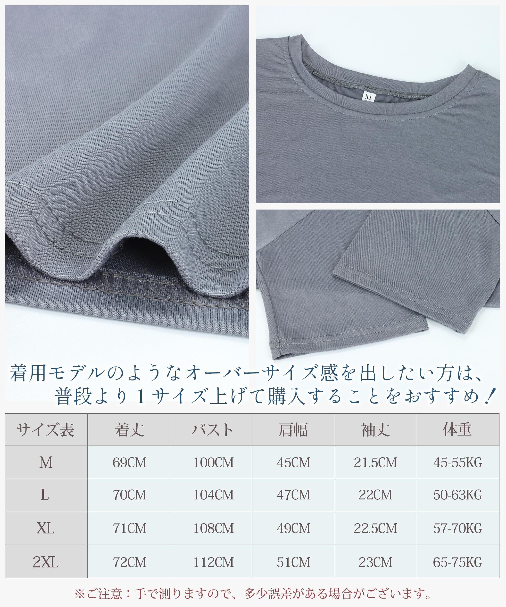 【素材&大きいサイズ】素材構成:95%ポリエステル、5%スパンデックス。 4つのサイズ:● M(着丈:69cm、胸幅:100cm、袖丈:21.5cm、肩幅:45cm);● L(着丈:70cm、胸幅:104cm、袖丈:22cm、肩幅:47cm);● XL(着丈:71cm、胸幅:108cm、袖丈:22.5cm、肩幅:49cm);●2XL(着丈:72cm、胸幅:112cm、袖丈:23cm、肩幅:51cm)。※ 着用モデルのようなオーバーサイズ感を出したい方は、普段より1サイズ上げて購入することをおすすめ!サイズは平置き採寸です。多少の誤差がある場合がございますのでご了承下さいませ。