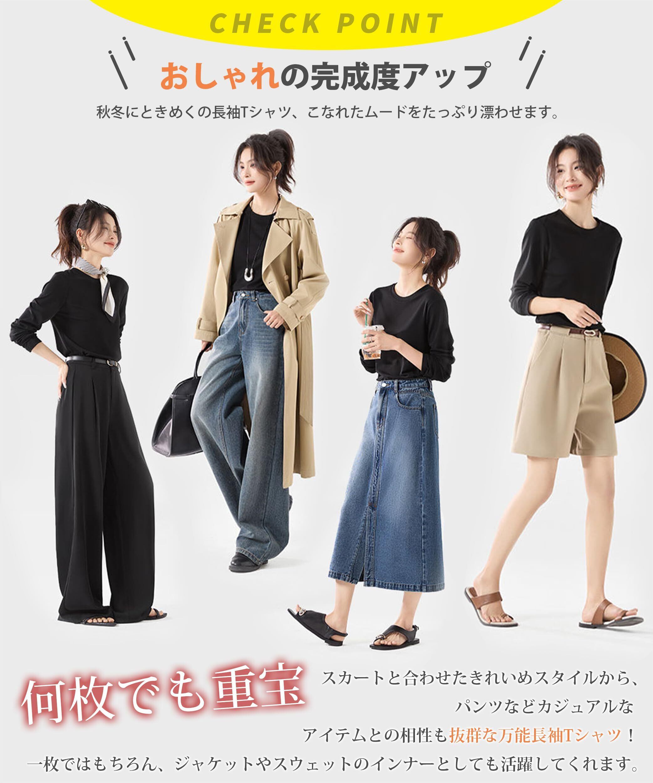 【秋冬コーデの主役】シンプルながらも今っぽさを感じられるレディース長袖Tシャツ、気分や気候が変わると重宝しています。ゆったりしたシルエットの長袖Tシャツ、体のラインを拾い過ぎず、着るだけで落ち感が出ています。静電気が起きにくい生地のロングtシャツ、1枚でサマになり、ジャケットやコートを重ねる秋冬コーデにもご着用いただけます。