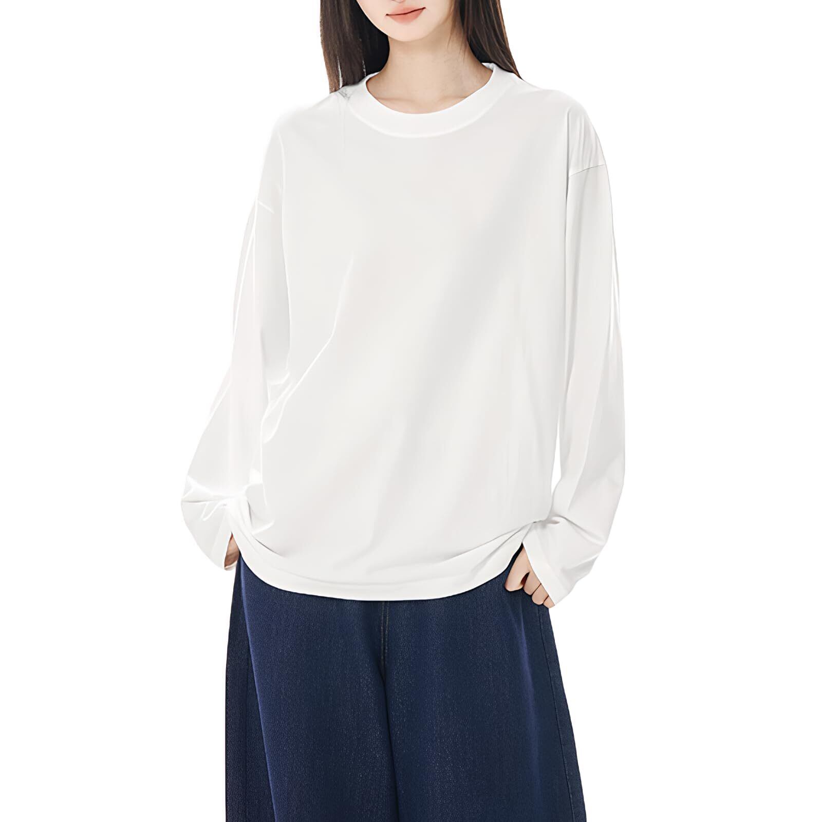 【秋冬定番!長袖 T シャツで小顔 & 快適保温両立】 肌寒い朝晩や室内での肌寒さ対策に最適な、軽量で保温性抜群の長袖 T シャツです クルーネック(丸首)デザインが首元をスッキリ演出し、小顔効果で顔周りを美しく見せる。 ゆとりのあるシルエットが「太ももが太い」「肩幅が気になる」といったお悩みをカバーし、リビングでくつろぐ時や買い物・散歩といった日常外出シーンで、寒い風を遮断しながら “着痩せ” スタイルを維持!