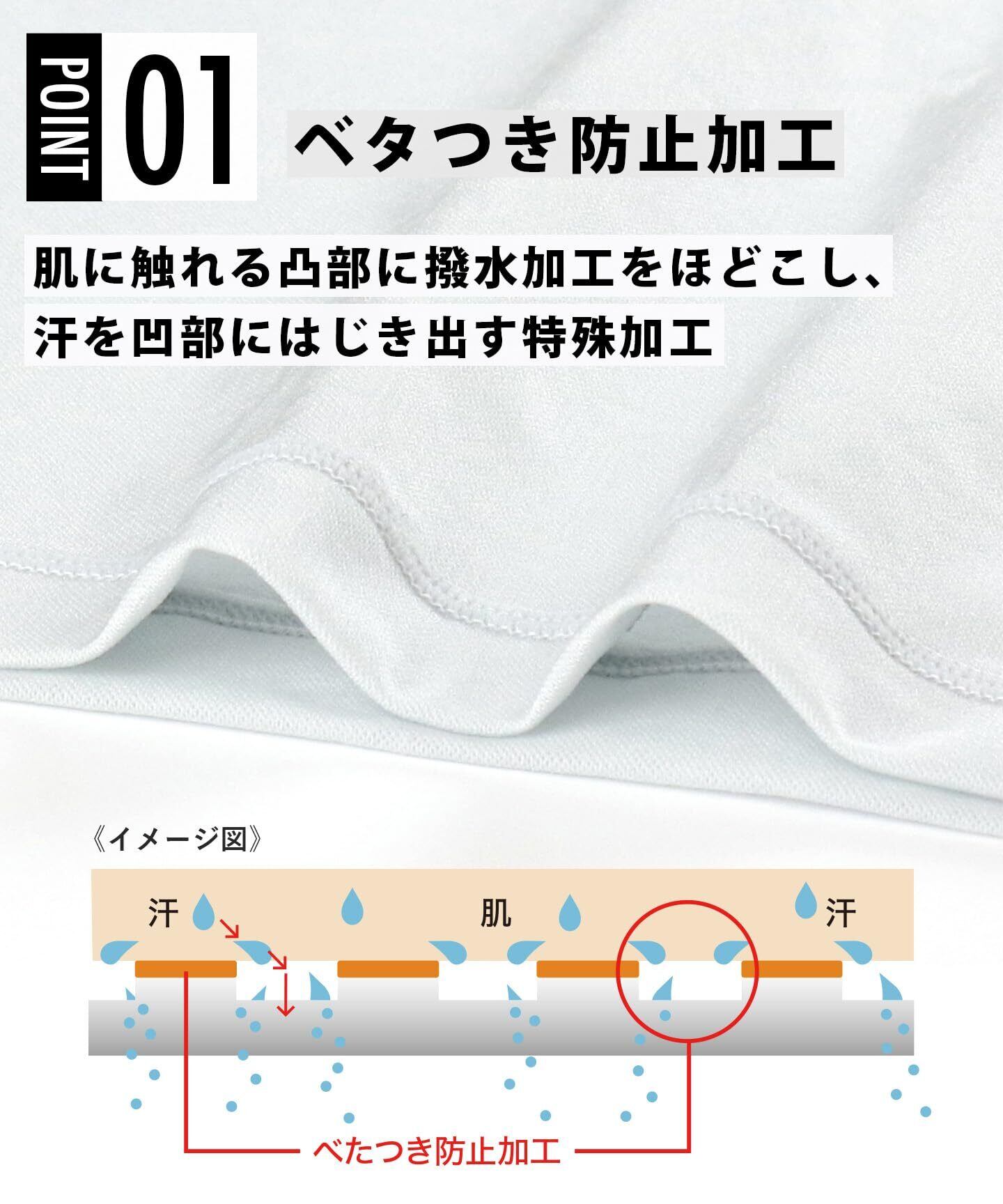 べたつき防止加工 肌に触れる凸部は撥水加工をほどこし汗をはじき、凹部にはじき出す特殊加工。
