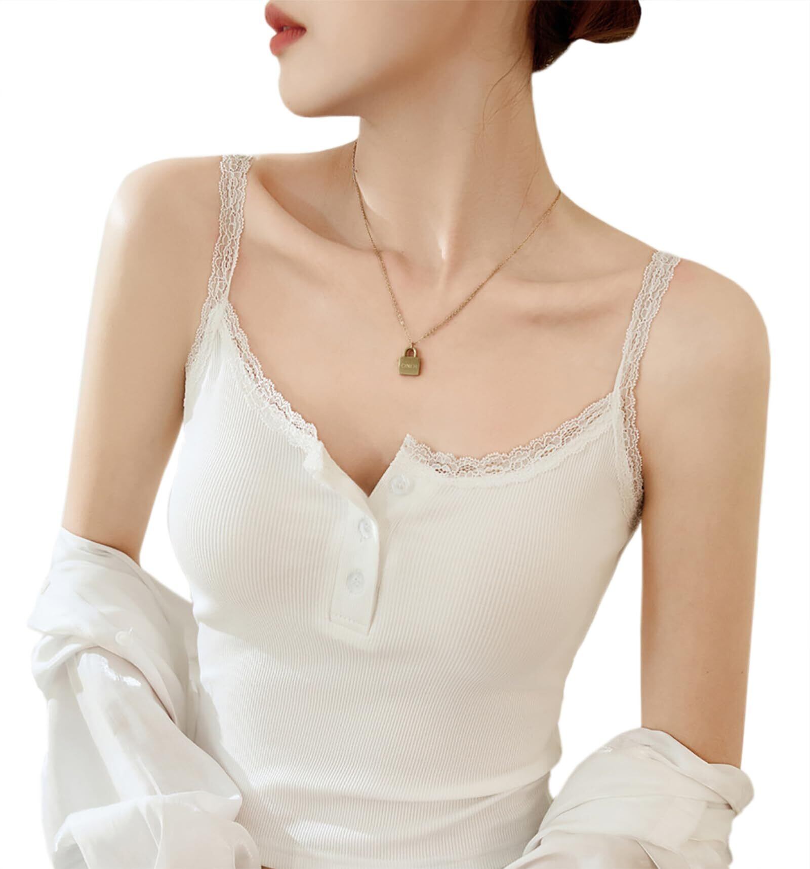 [Laisve] レース胸元あき コットン95% 爆乳キャミソール3色 レディース リブニット生地 ボタンをはずす 貧乳爆乳兼用 セクシー谷间 重ね着インナー ベーシックタンクトップ ビスチェ 可愛い…