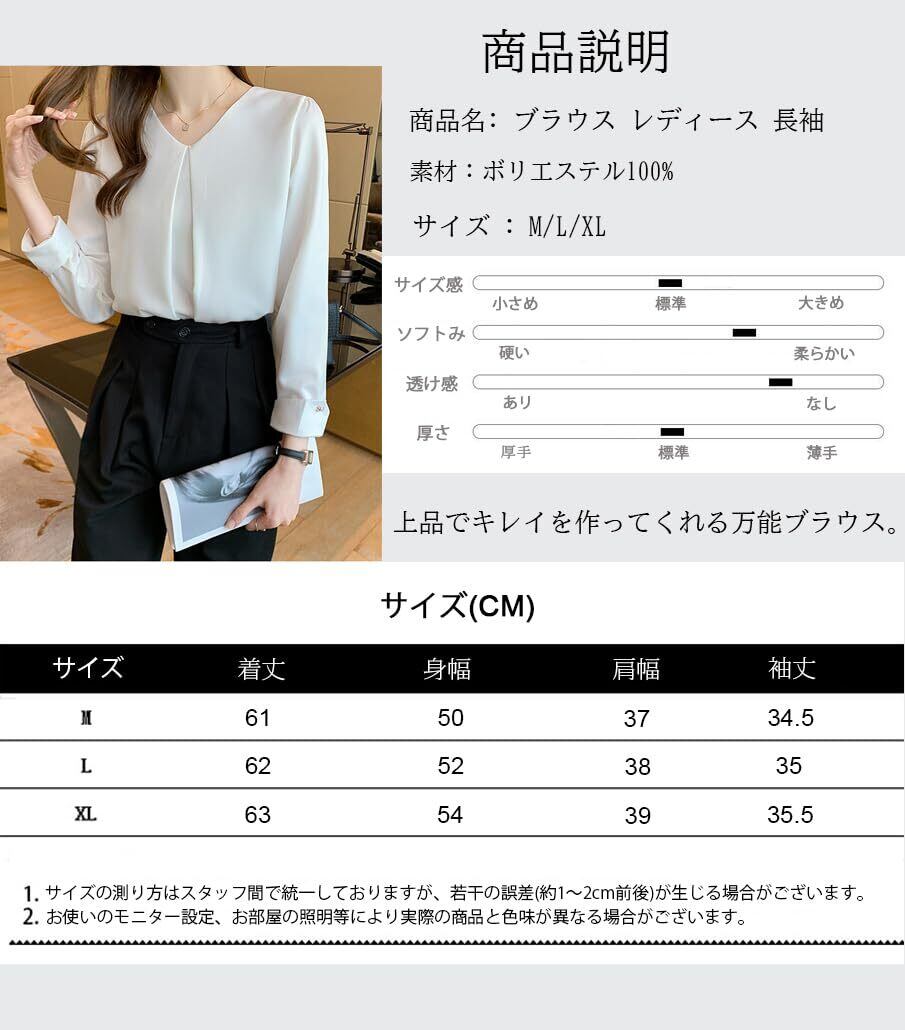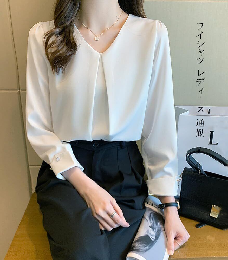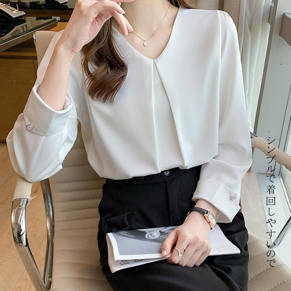 [Xiaoyu] ブラウス レディース 長袖 シフォン シャツ Vネック オフィス カジュアル トップス タック 体型カバー 可愛い