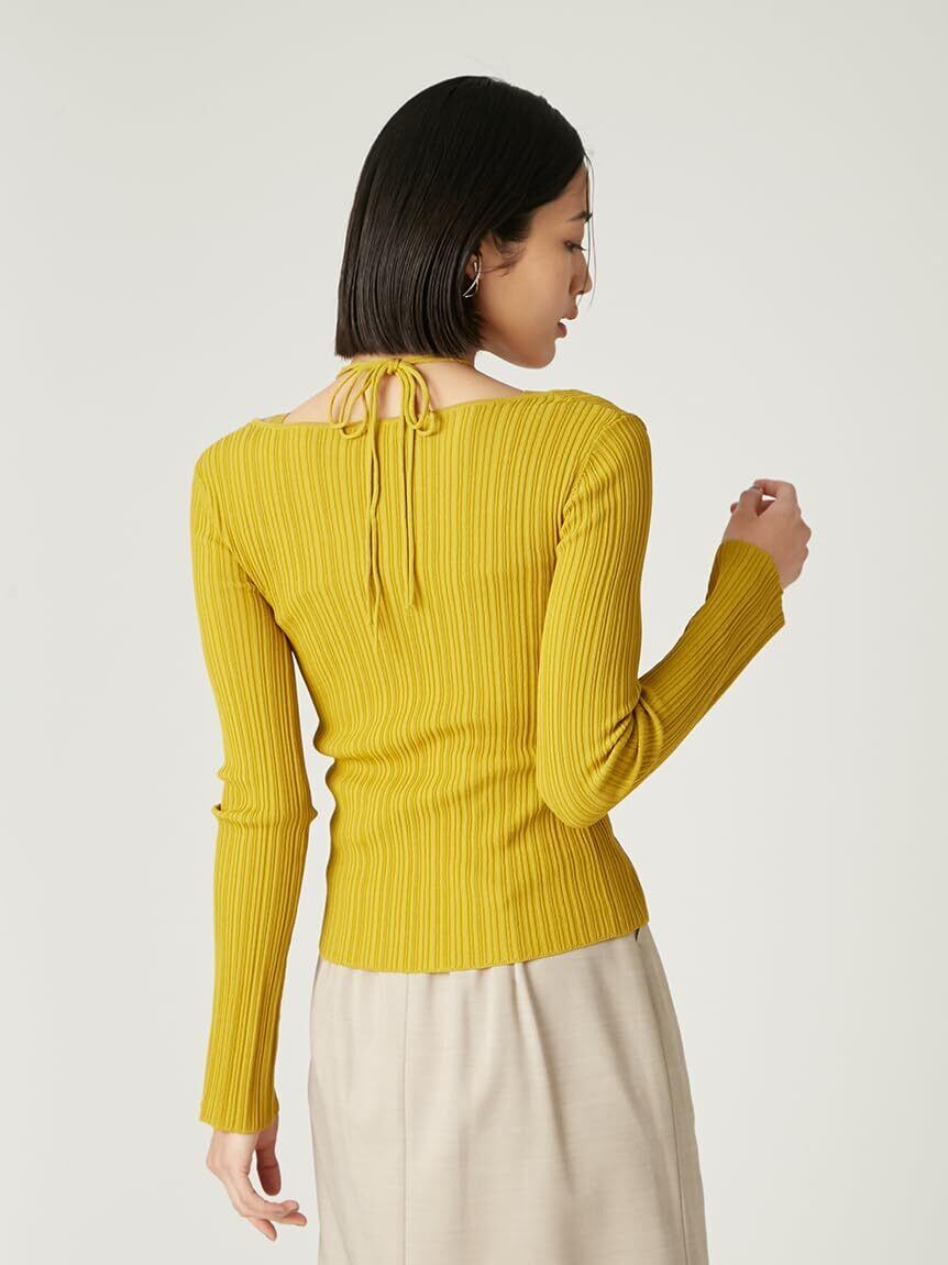 首元の紐は取り外しが可能で、肩で結んだりホルター風に結んだり、さまざまにアレンジできるのもポイント。