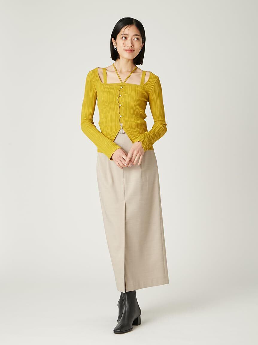 カーディガンは、ほんのりシアーな薄手のランダムリブに編み立てています。暑い季節からさらっと羽織れる、軽い素材感。
