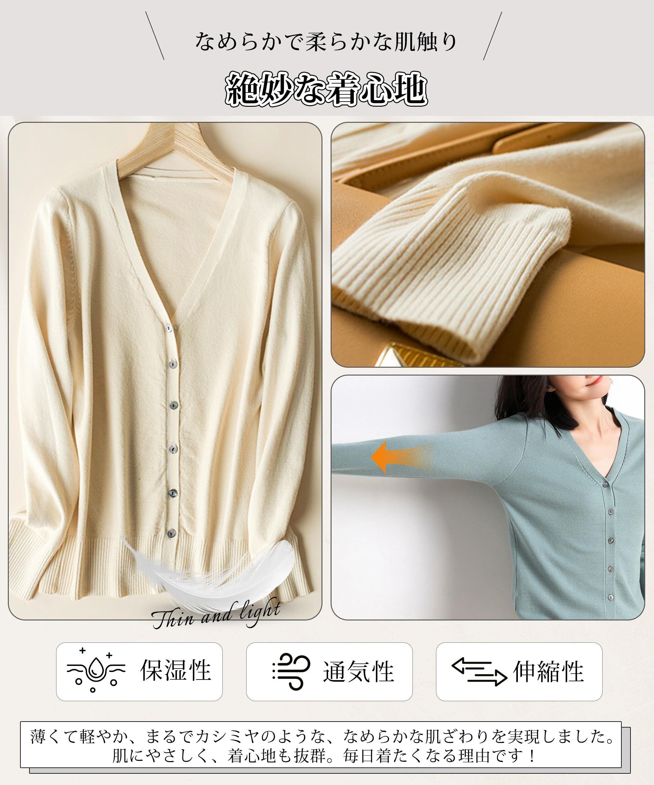 【柔らかな肌ざわり・極上の着心地】フェミニンな印象のVネック長袖ニットカーディガンが、この季節にぴったりのアイテムとして新登場。上質なニット素材を厳選し、まるでカシミヤのようになめらかな肌ざわりを実現しました。軽やかでやわらかく、伸縮性・通気性にも優れています。素肌に触れてもチクチクしない、とろけるような心地よさ。とにかく袖を通してもらいたいカーディガンです。