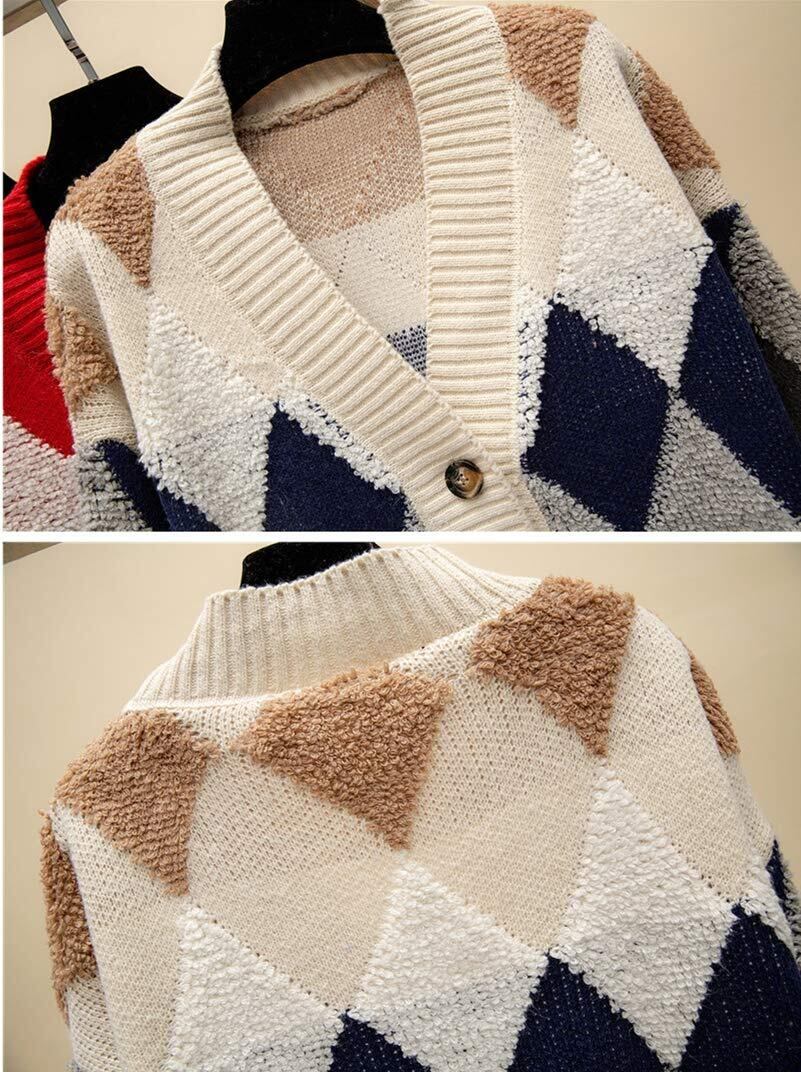 【人気商品】カーディガン レディース ニット アウター 羽織り ボア トップス アーガイル Vネック 秋冬 フリーサイズ
