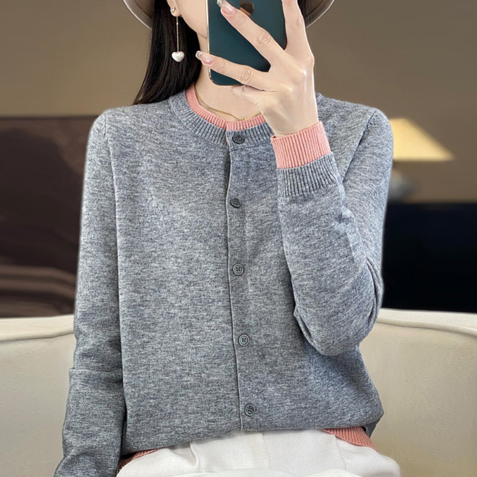[Niliv] クルーネックカーディガン レディース 長袖 ニット 2種類のカラーマッチング 丸首 カーディガン コート 軽い オフィス 事務服 オールシーズン