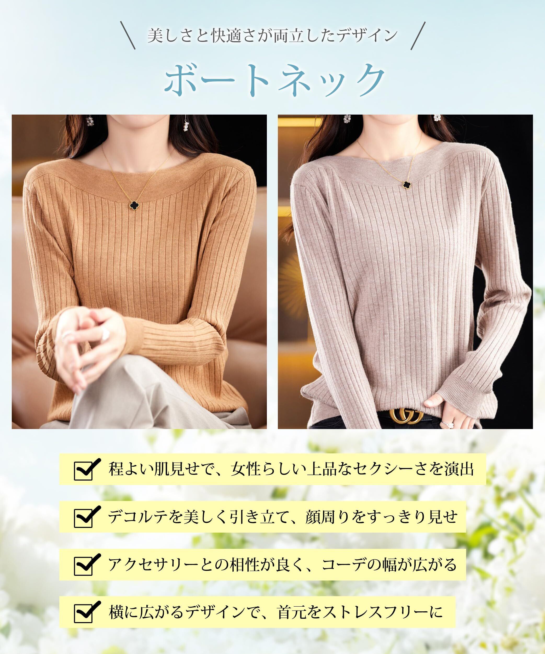 【女性らしさボートネックニット】シンプルながら女性らしさを引き出すデザインで、秋冬のコーディネートの主役として活躍する一枚。このレディース ニットトップスは広めのボートネックが首元を優雅に強調。程よい肌見せで、女性らしい上品なセクシーさを演出します。普段使いから特別な日まで、幅広いシーンで活躍します。