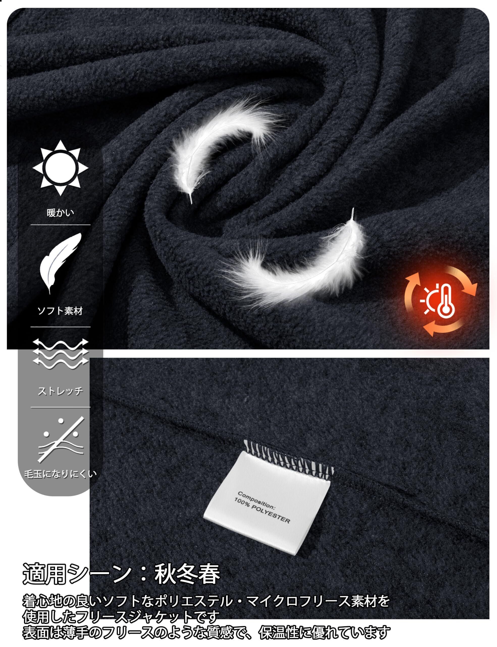 生地: 着心地の良いソフトなポリエステル・マイクロフリース素材を使用したフリースジャケットです。 表面は薄手のフリースのような質感で、保温性に優れています