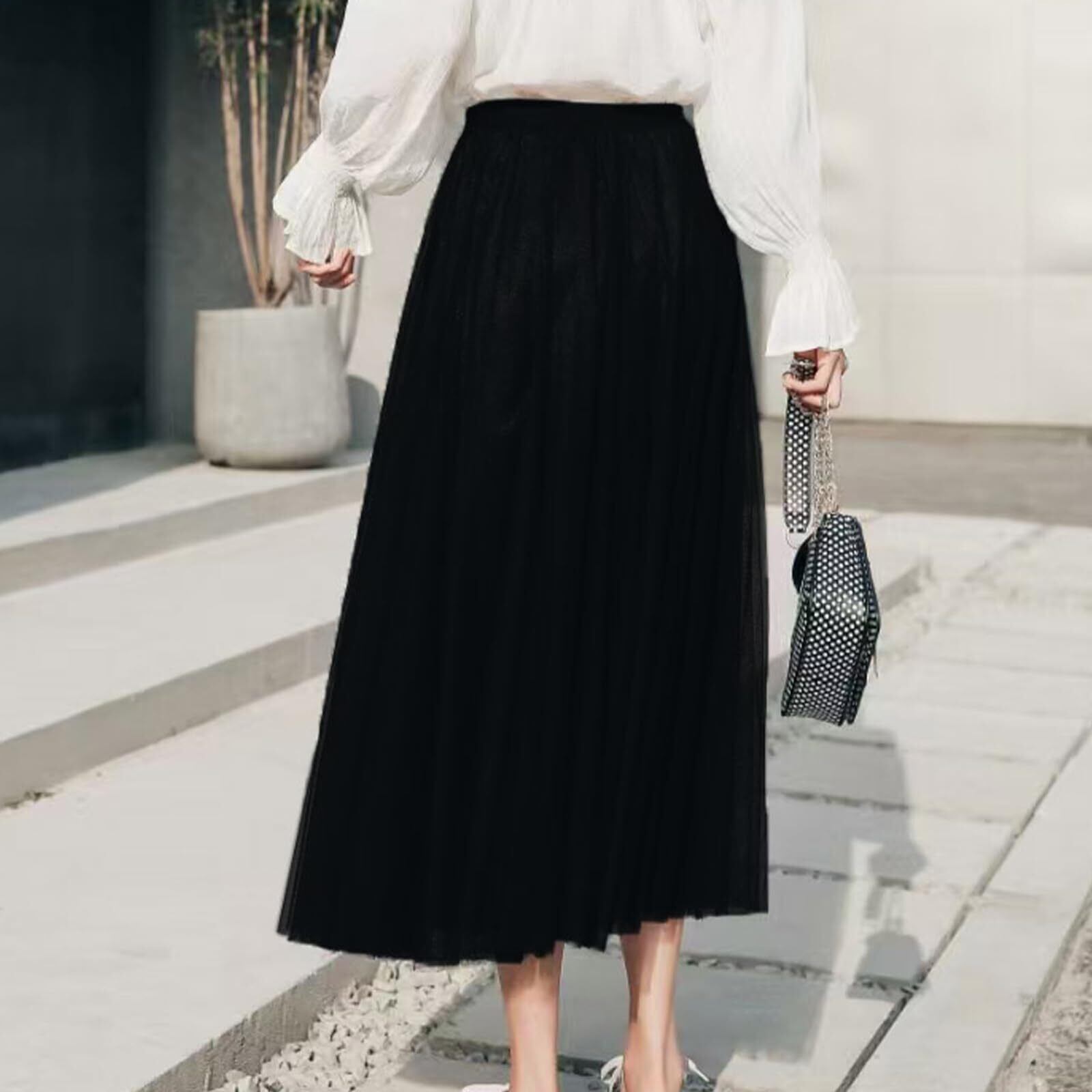 グレー、ベージュ(アプリコット)、黑(ブラック)、コーヒー、シャンパー(ピンク)、ダークグレー 白(ホワイト)、緑(グリーン)の8色を用意致しているロングスカートを登場しましたふわふわでいい感じ、歩くたび美シルエットがふんわりと展開され、二重チュールの十分なプリーツが入っていて、、おしゃれで可愛い雰囲気たっぷりしたプリーツスカートです。 柔らかく心着がよい裏地が付いて安心に着用いただけて肌触りも快適になるフレアスカート。