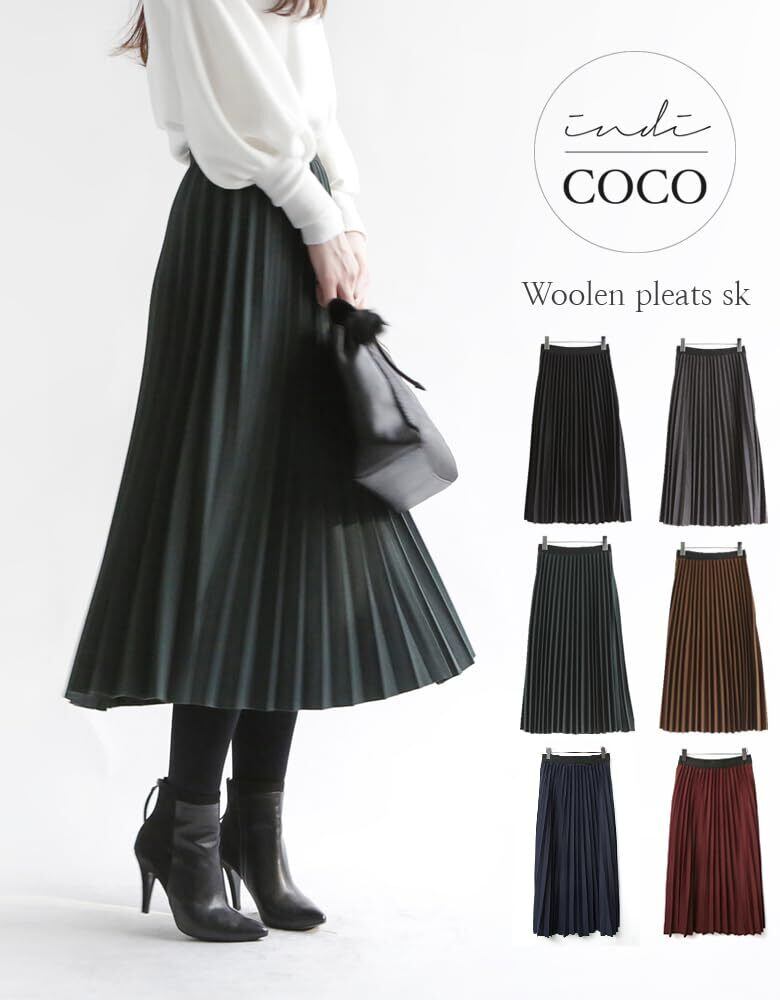 [indicoco] プリーツスカート ウールスカート レディース プリーツスカート ぷりーつすかーと ロング丈 長め丈 スカート 着回し 楽ちん ウエストゴム 上品 フェミニン ゆったり ルーズ 春 秋 冬 秋冬 自社生産 プラウ