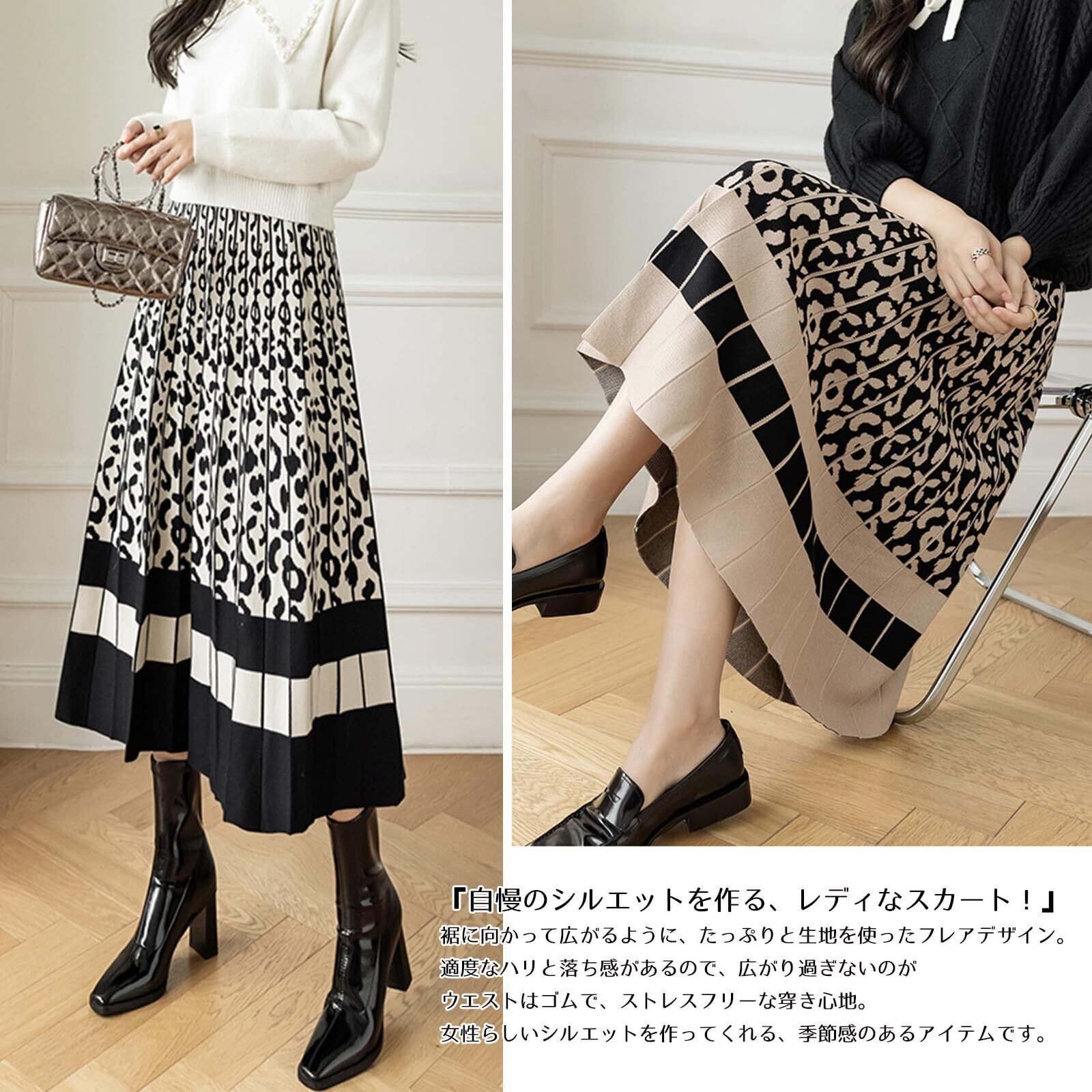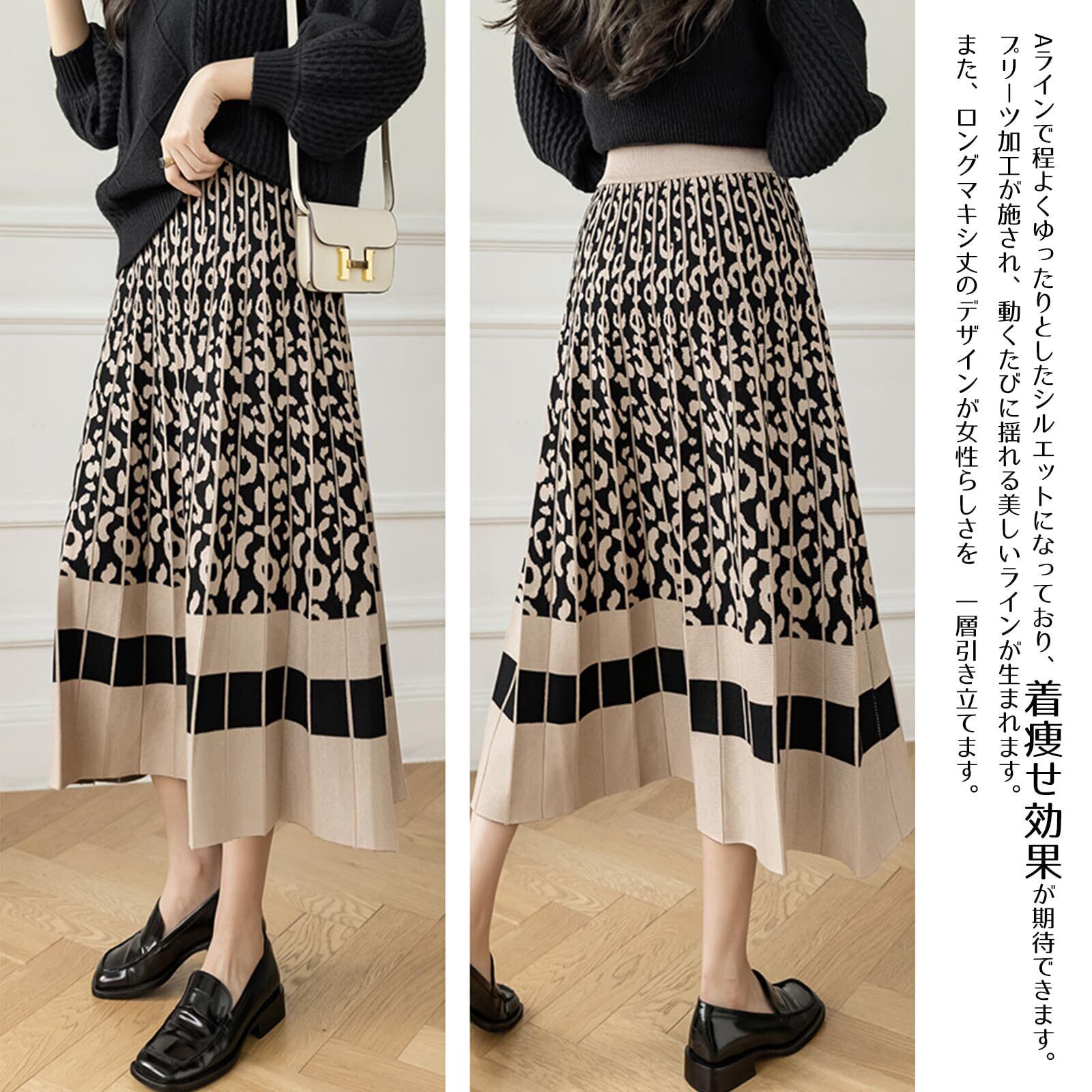 【新春セール】[RoyzTocz] プリーツスカート レディース ロング スカート ニットスカート レオパード柄 スカート 切り替え ウエストゴム ラシャ シンプル ゆったり 体型カバー おしゃれ 着痩せ 大人 ボトムス 通勤 二次会 普段着 秋 冬