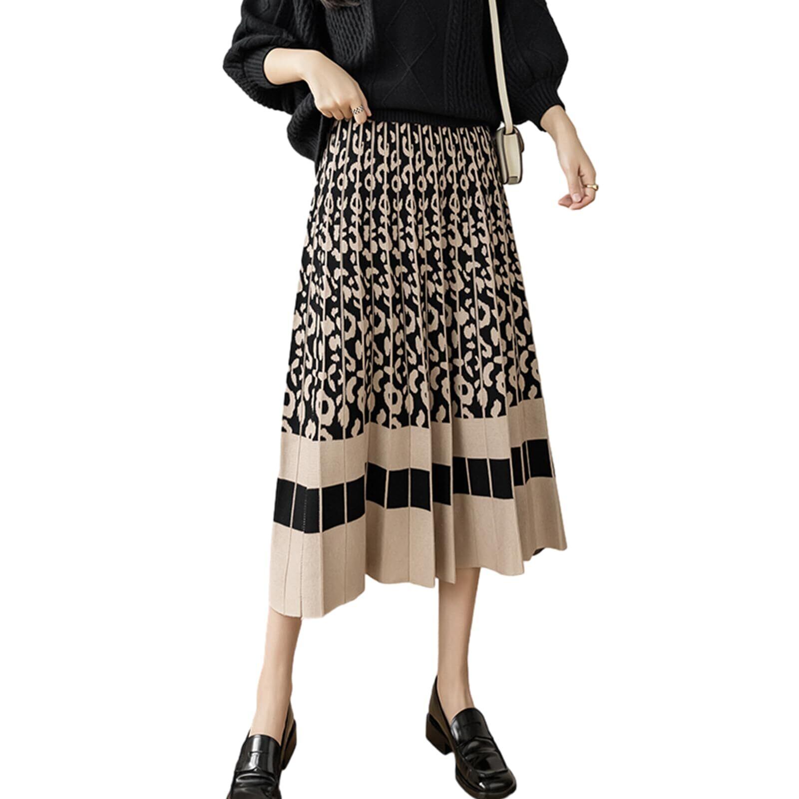 [RoyzTocz] プリーツスカート レディース ロング スカート ニットスカート レオパード柄 スカート 切り替え ウエストゴム ラシャ シンプル ゆったり 体型カバー おしゃれ 着痩せ 大人 ボトムス 通勤 二次会 普段着 秋 冬