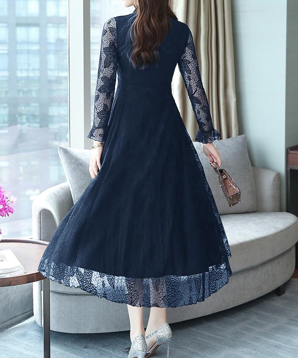 【2022最新】[Sueeya] (スイーヤ) ワンピース レディース レース ロング フリル ドレス 長袖 フレア 総柄 可愛い ハイウエスト 着痩せ おしゃれ シアー きれい 裏地付き パーティー 結婚式 通勤 二次会