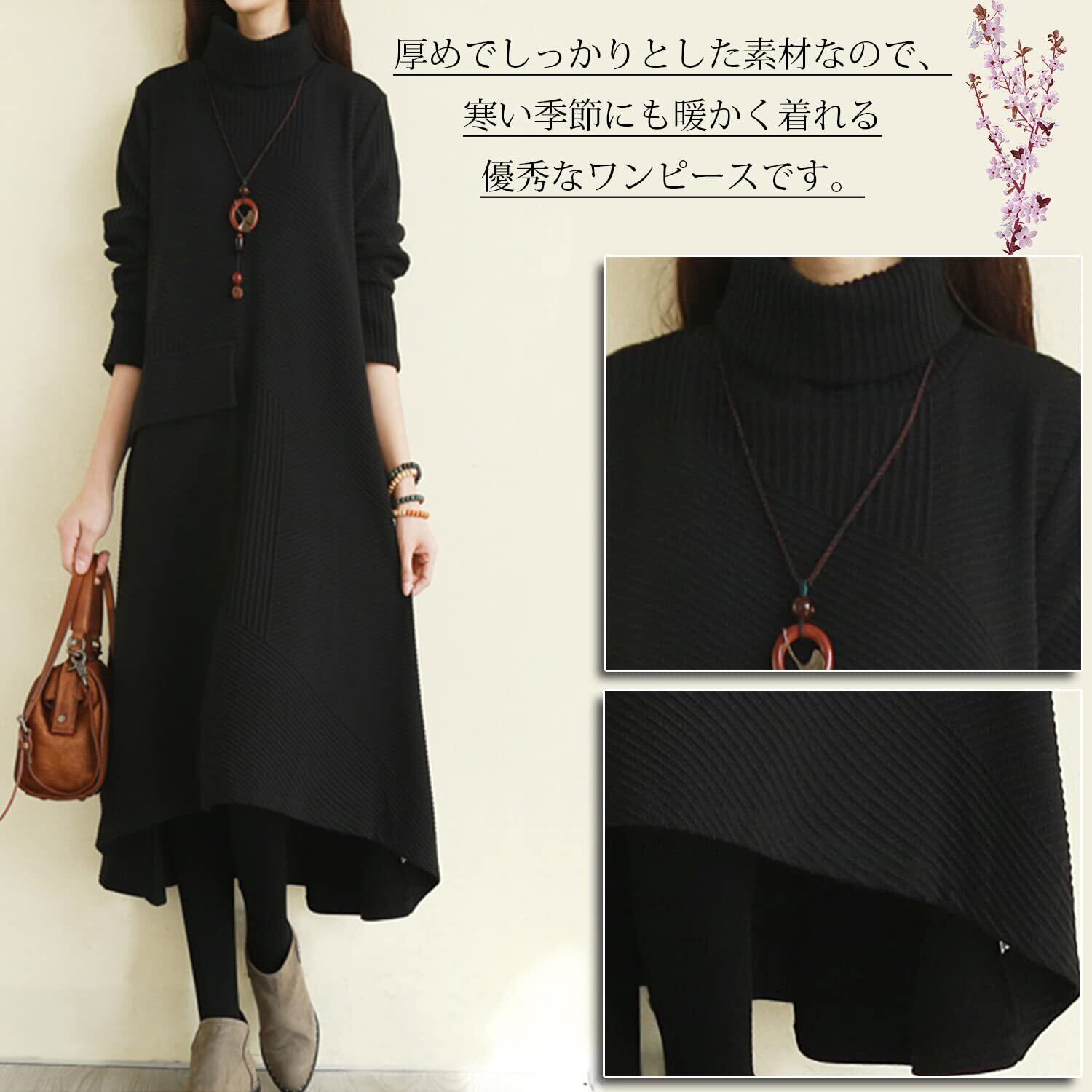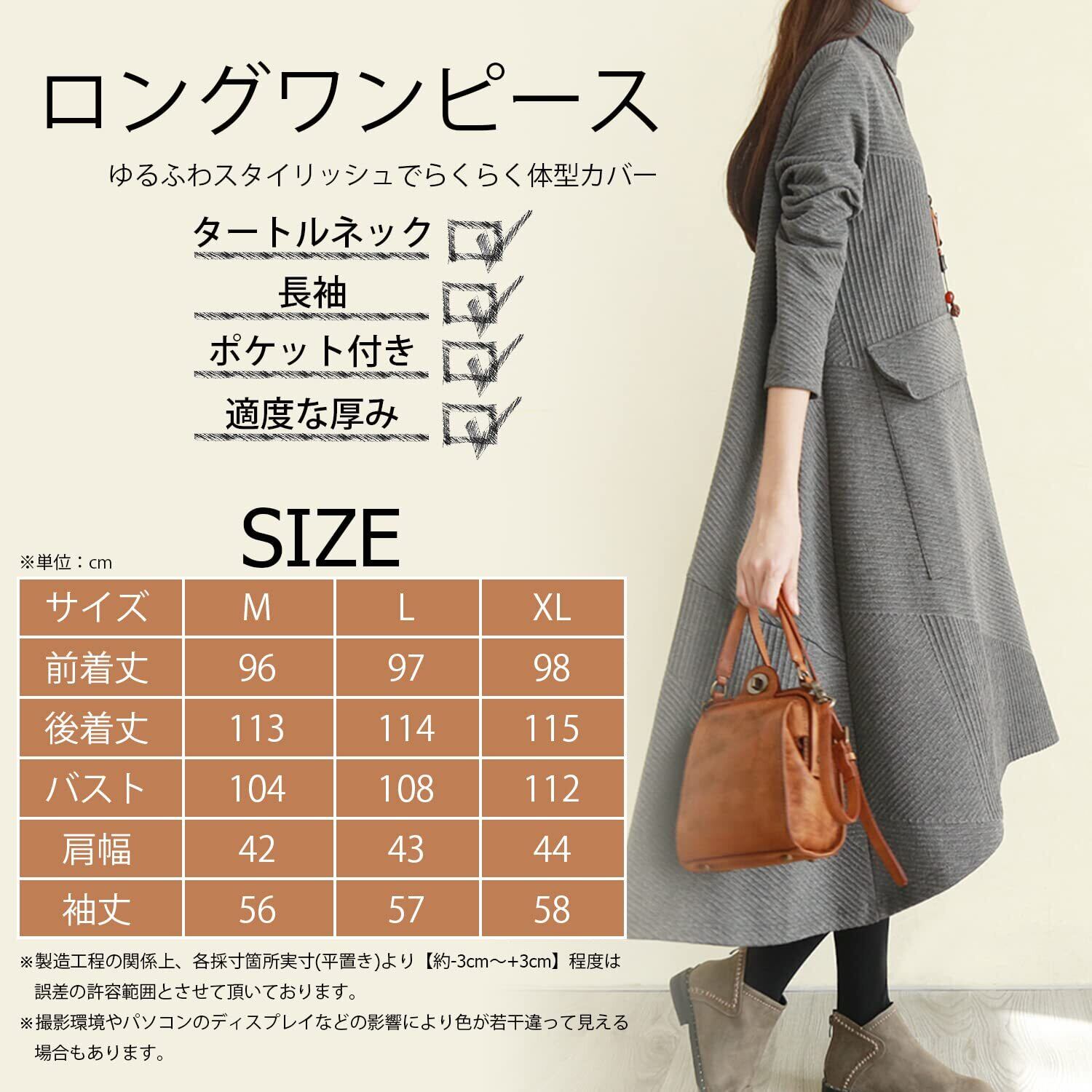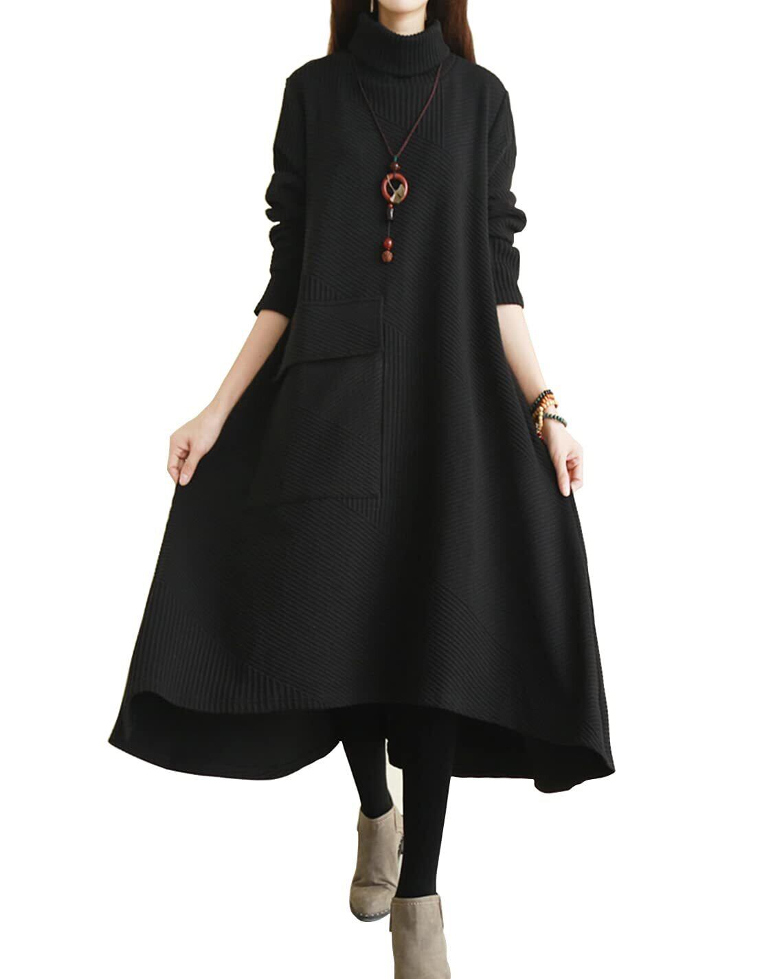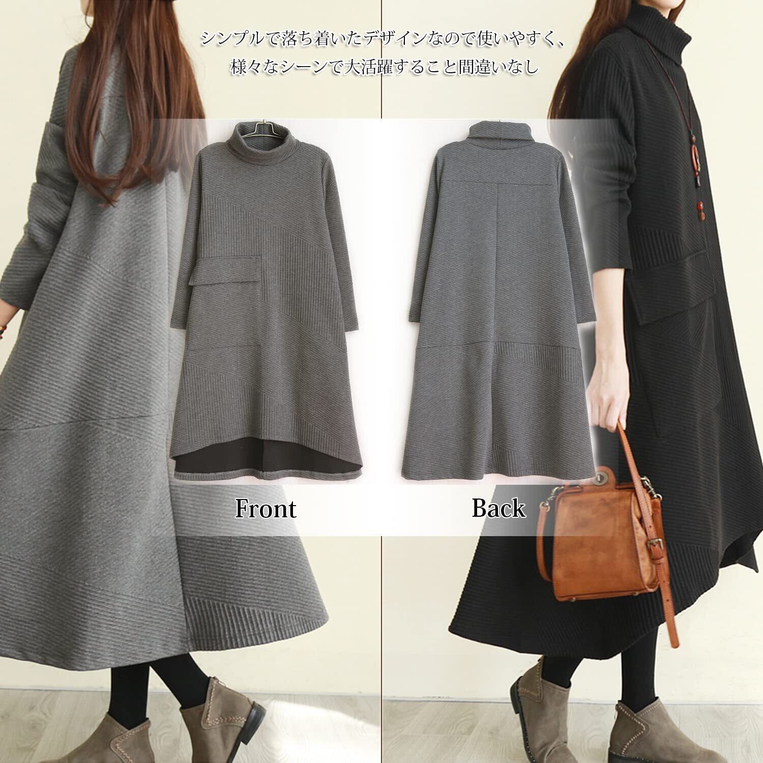 [INNIFER] ワンピース レディース 秋 冬 ハイネック 長袖 無地 体型カバー 着痩せ ゆったり ひざ丈 Aライン ロングワンピース プルオーバー 通勤 カジュアル
