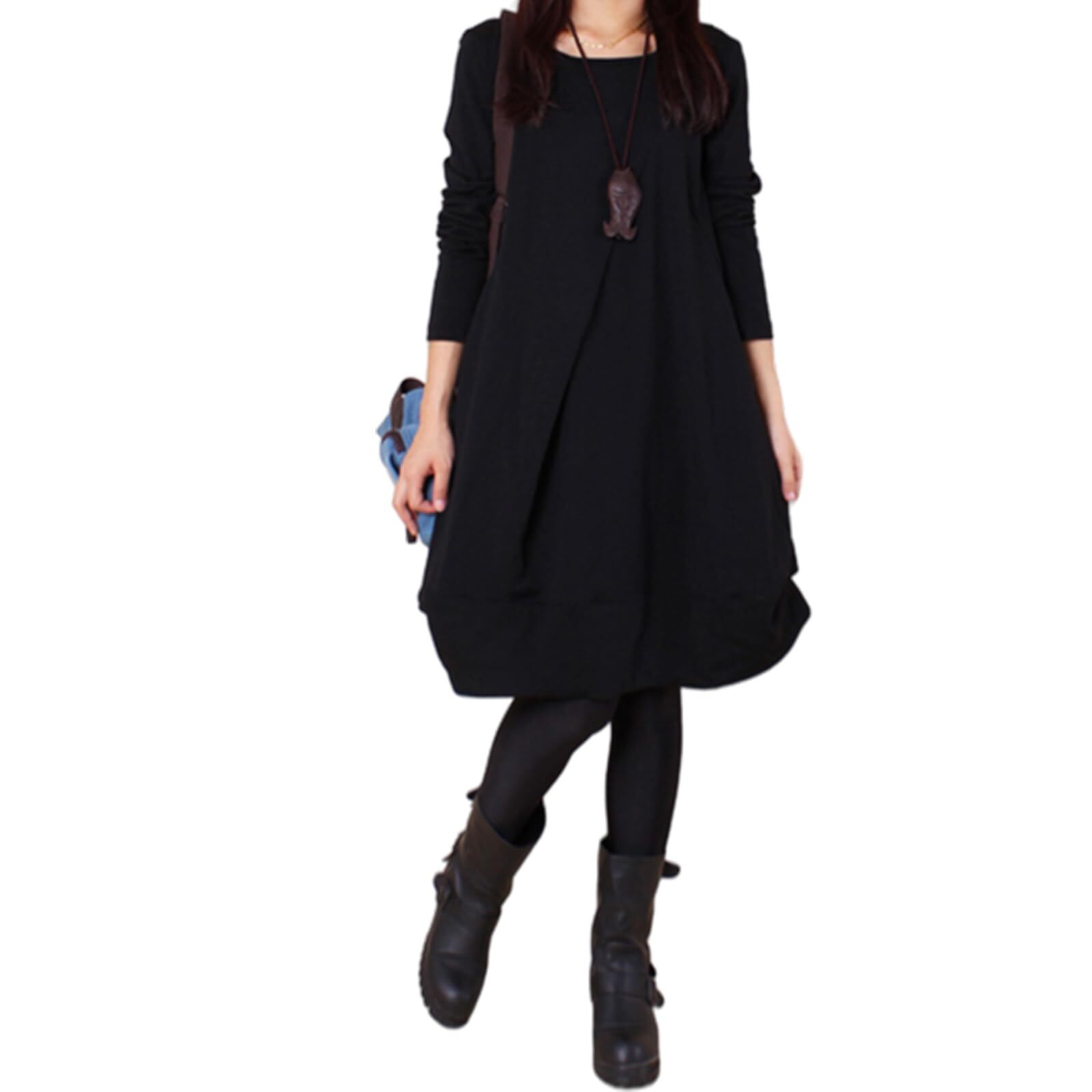 【特価セール】[WoauNuiHll] ワンピース レディース チュニック 長袖 ロングワンピース 膝丈 丸首 無地 大きいサイズ 体型カバー ゆったり ファッション 通勤 春 秋 冬