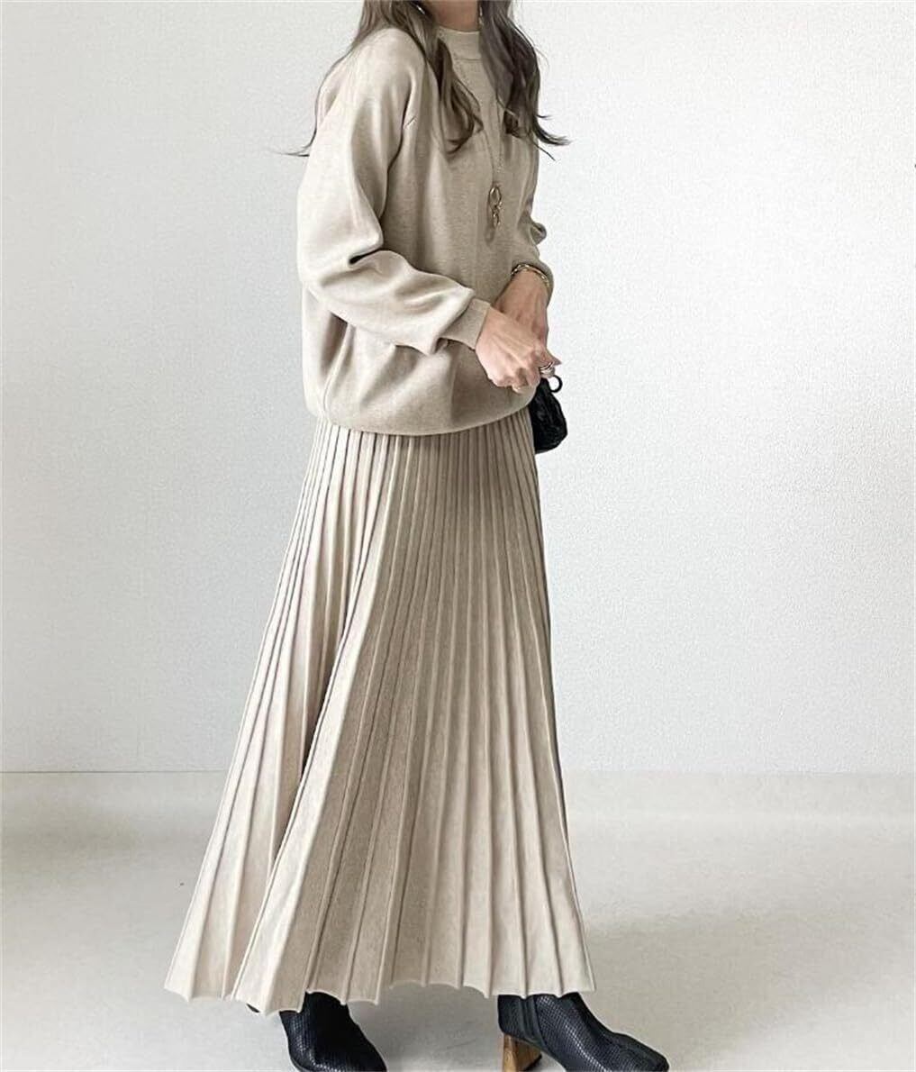 【2022最新】[Qian qian] ニット セットアップ レディース ハイネック ニットスカート スーツ ニットセーター+ロングスカート プリーツ ワンピース スウェットスカート 上下セット 長袖 切り替え ギャザー フリル フレア 仕事着