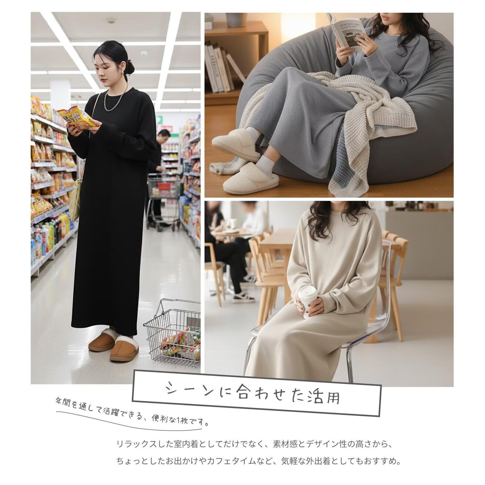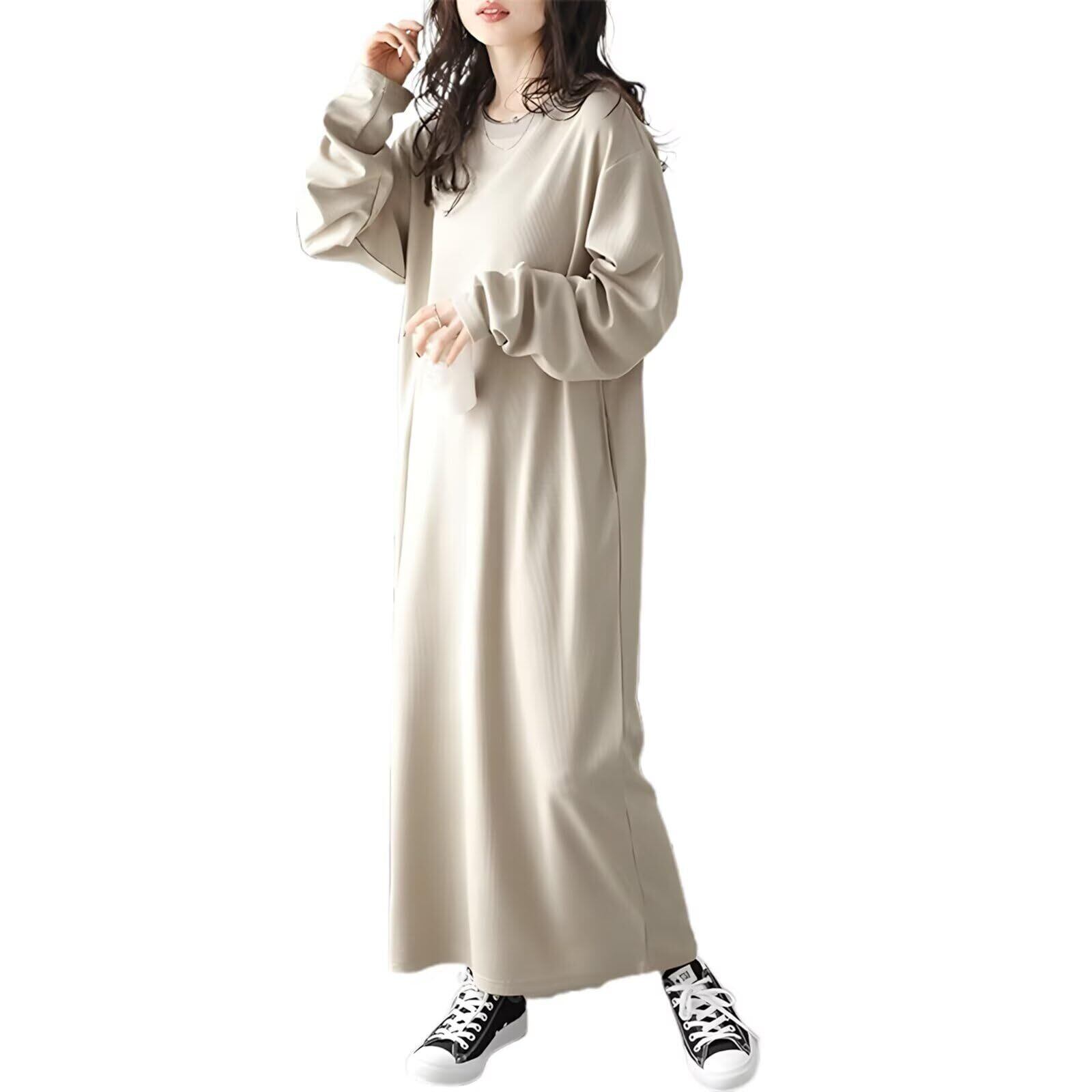 【商品概要】ワッフル独特の凹凸が特徴的な、レディースロングスリーブワンピース。MとLの2サイズに、ブラック、ダークグレー、ライトグレー、ベージュの全4色を展開。足首までを優雅に覆うマキシ丈と、ゆったりとしたルーズシルエットが魅力です。