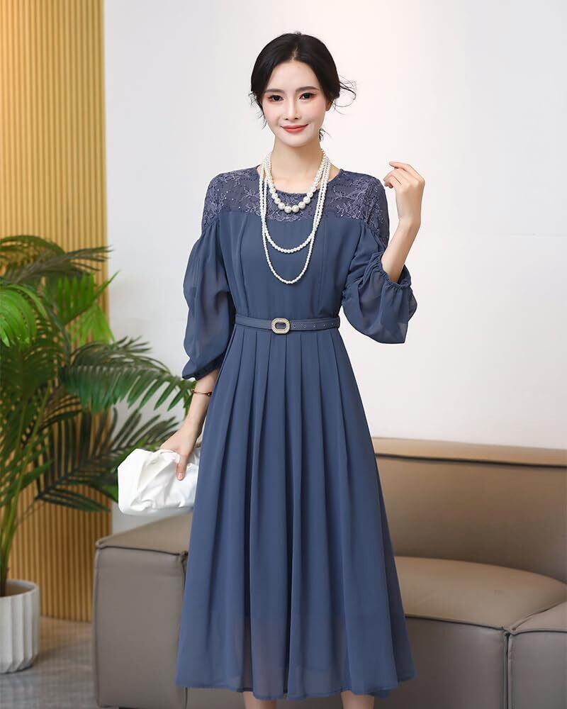 【数量限定】[Collecala] ドレス レディース 肩レース切り替え ロング ミモレ丈 ランタンスリーブ5分袖 フレア Aライン 可愛い ハイウエスト 着痩せ おしゃれ 取り外しベルト 裏地付き きれいめパーティー 結婚式 通勤 二次会ドレス