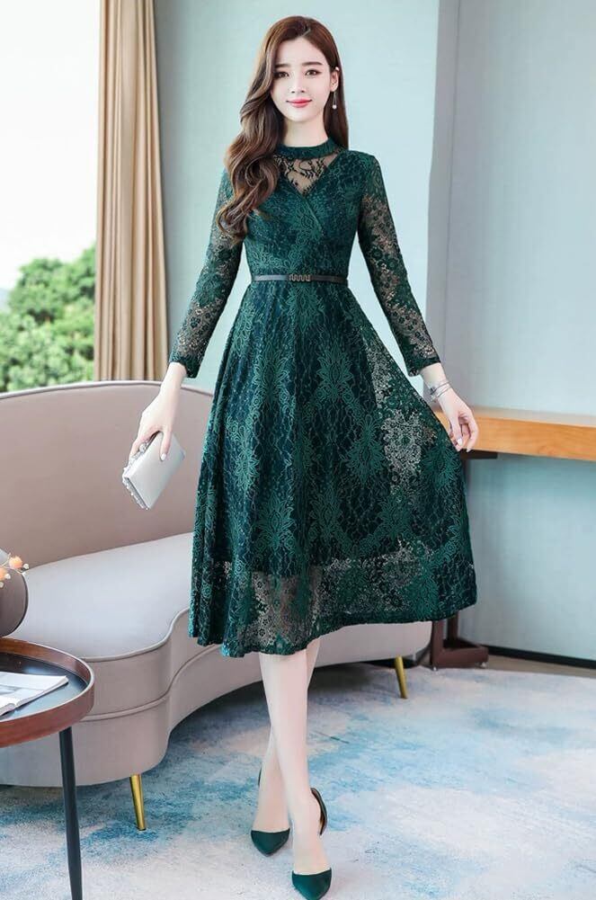 [Chubikime] ワンピース レディース 結婚式 ドレス パーティードレス 総レース 長袖 ミディアム丈 Aライン レースワンピース 裏地あり ベルト付き 着痩せ フォーマル お呼ばれ 二次会 きれいめ