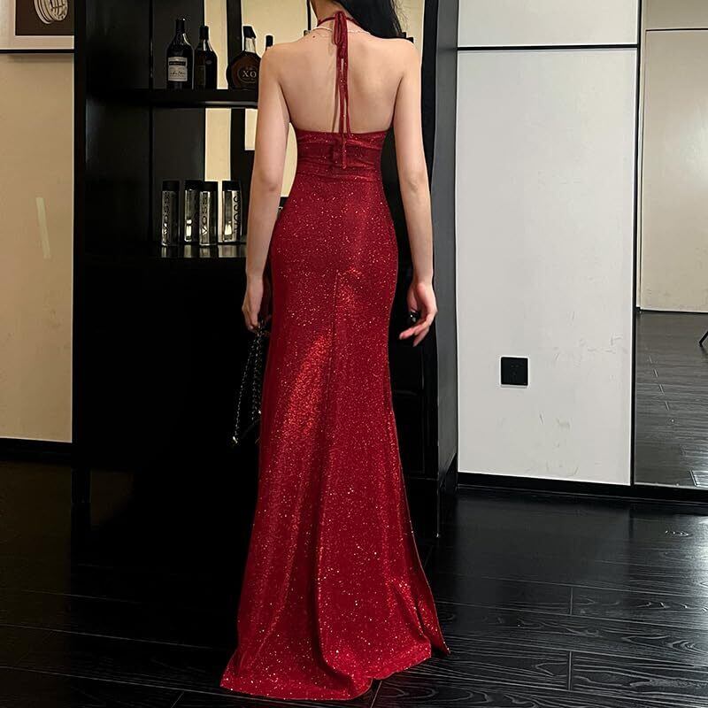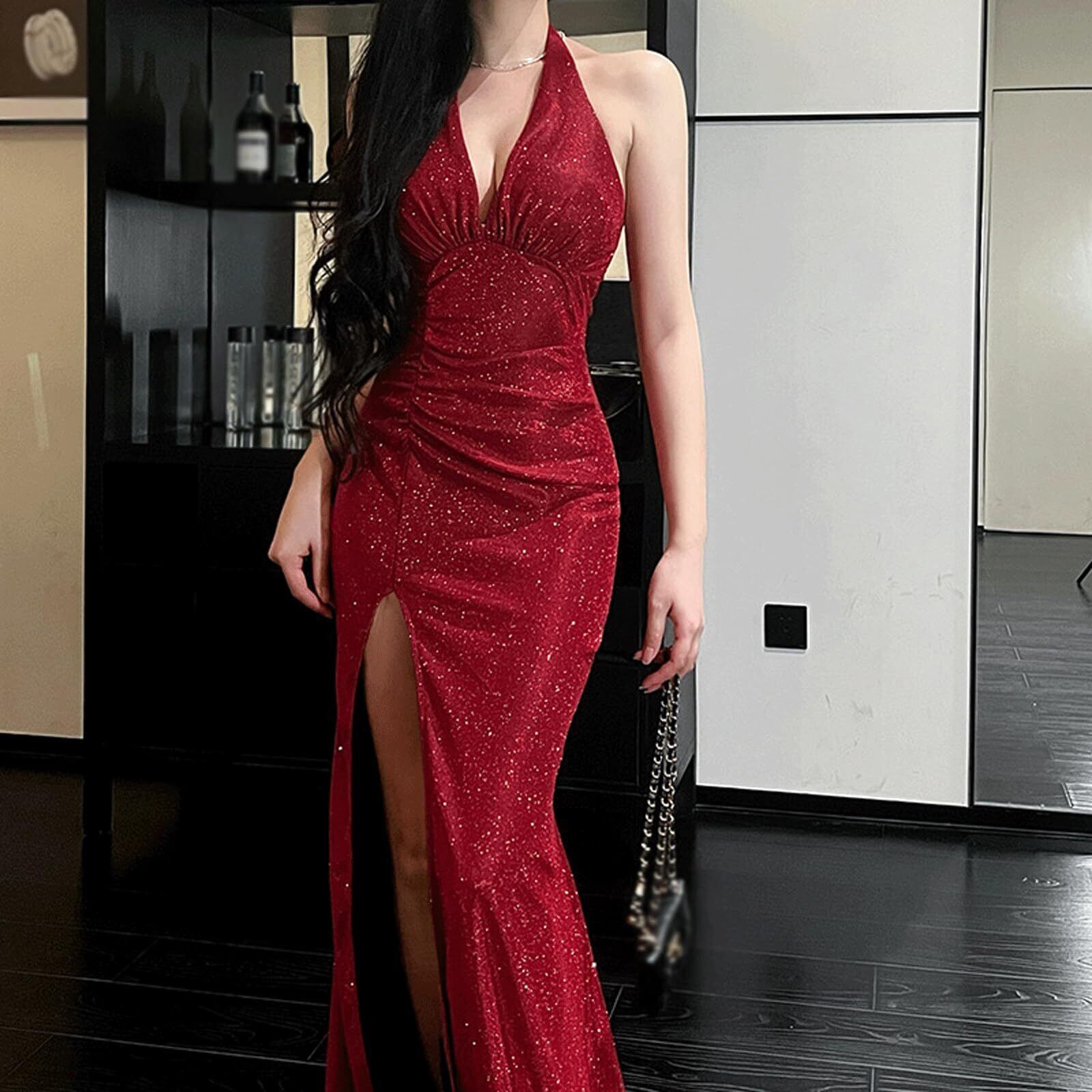 【特価商品】[EYPKPL] ポリエステルロングスカートの女性用Vネックホルタードレスイブニングドレスノースリーブウエストプリーツスリットスリットロングドレスカクテルドレス