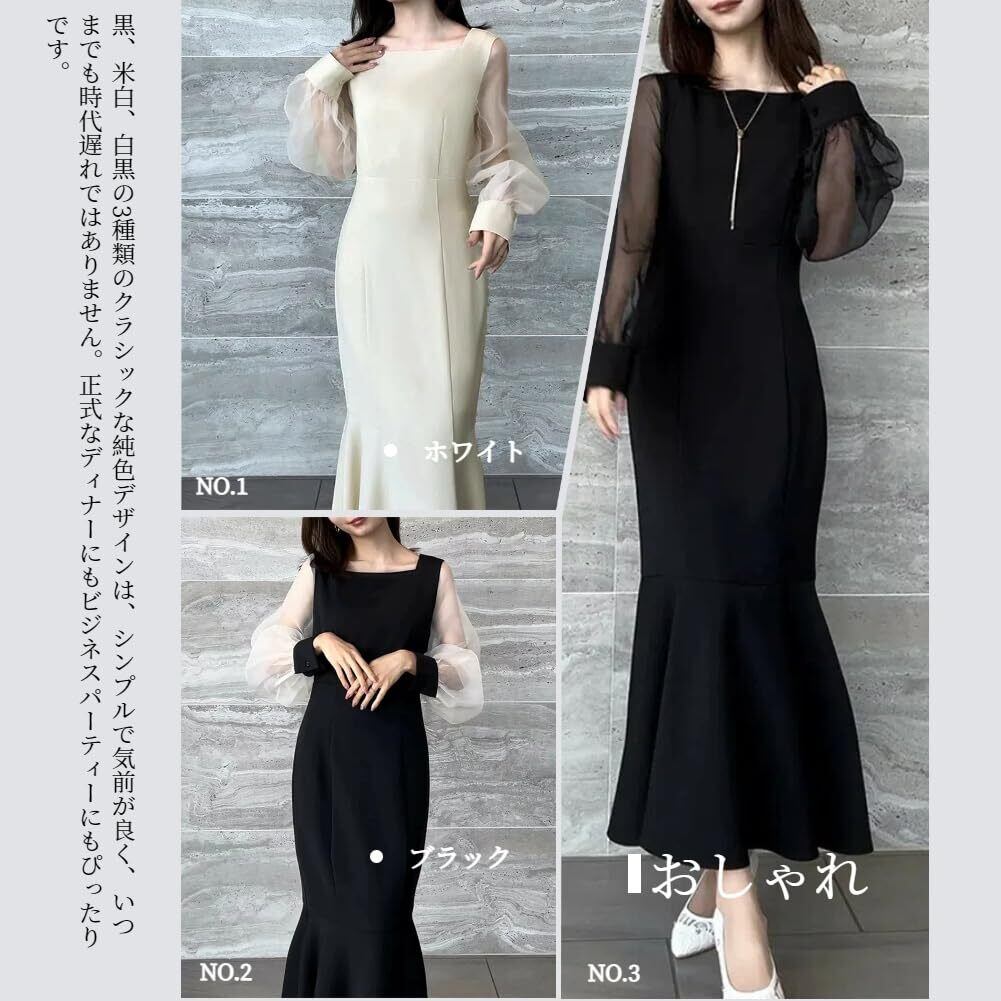 [EDREES] レディース マーメイドワンピース 無地 長袖 ネット糸 Uネック 切り替え エレガント マーメイドドレス ロング丈 シアー袖 透け 切り替え パーティー 結婚式 上品 セクシー 韓国風 二次会 発表会