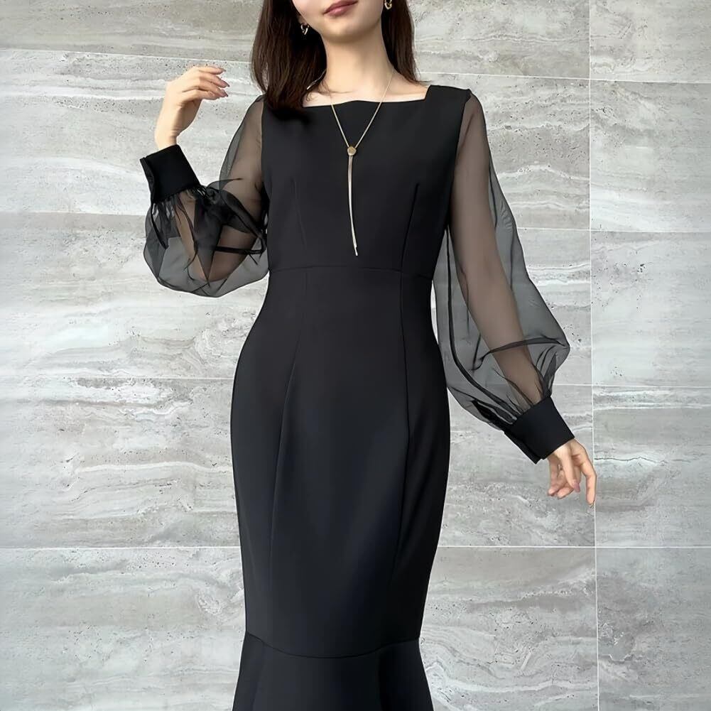 【在庫セール】[EDREES] レディース マーメイドワンピース 無地 長袖 ネット糸 Uネック 切り替え エレガント マーメイドドレス ロング丈 シアー袖 透け 切り替え パーティー 結婚式 上品 セクシー 韓国風 二次会 発表会