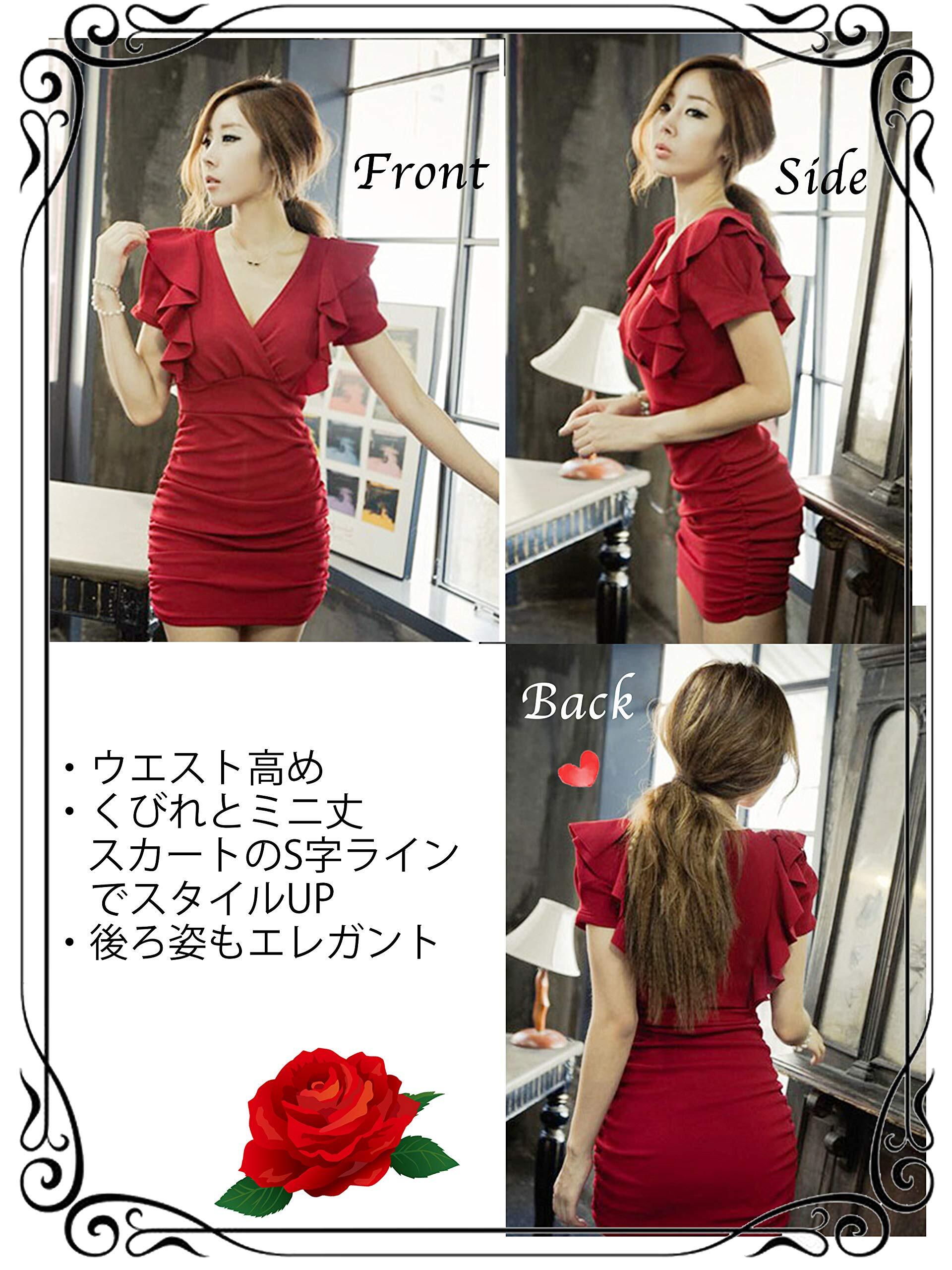 カシュクールの深めのVネックとウエストをキュッと絞ったグラマラスなS字ラインが魅力! デート、合コン・お呼ばれ・二次会・結婚式・食事会、キャバドレスやお仕事用にも大活躍大人セクシー愛されパーティドレス 袖のフレアが二の腕を華奢に体型カバー、ハイウエスト切り替えとミニ丈のスカートがスタイル良く魅せる! 深めのVネックが首元・デコルトを綺麗に、カシュクールのドレープがバストをふんわりと包み、ミニ丈スカートのサイドギャザーが動きやすい! 選べるブラック&レッドで勝負で映えるドレスワンピース。
