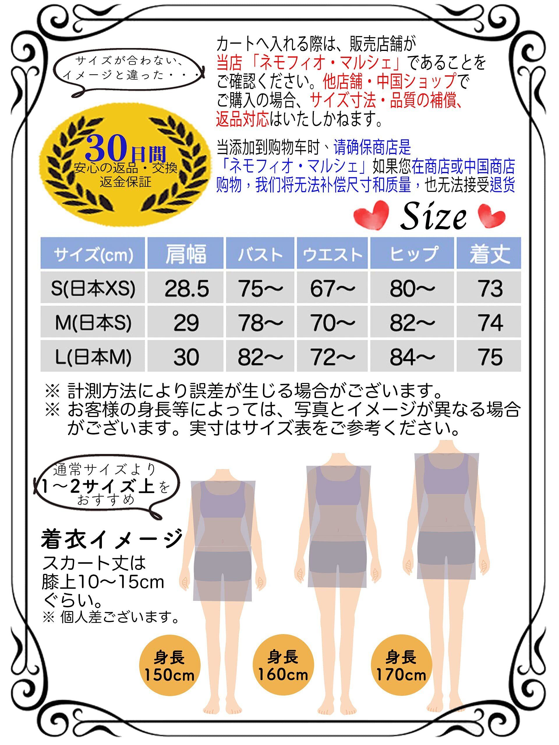 【M(日本S)】 バスト77cm〜 ウエスト63cm〜 ヒップ82cm〜 着丈72cm 【L(日本M)】バスト80cm〜 ウエスト66cm〜 ヒップ84cm〜 着丈72cm