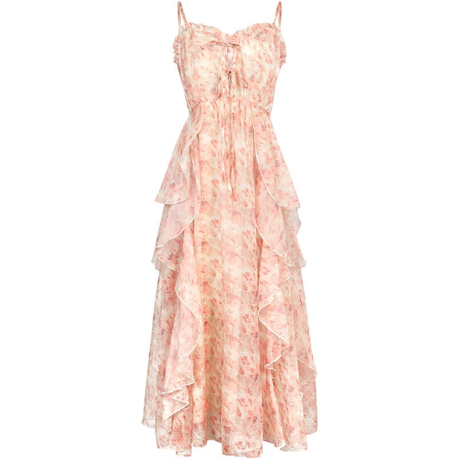 【2022最新】【プリントドレス】女性ヴィンテージレースアップコルセットビーチ夏 (Color: Pink Strap Dress, Size: L(57KG-63KG))