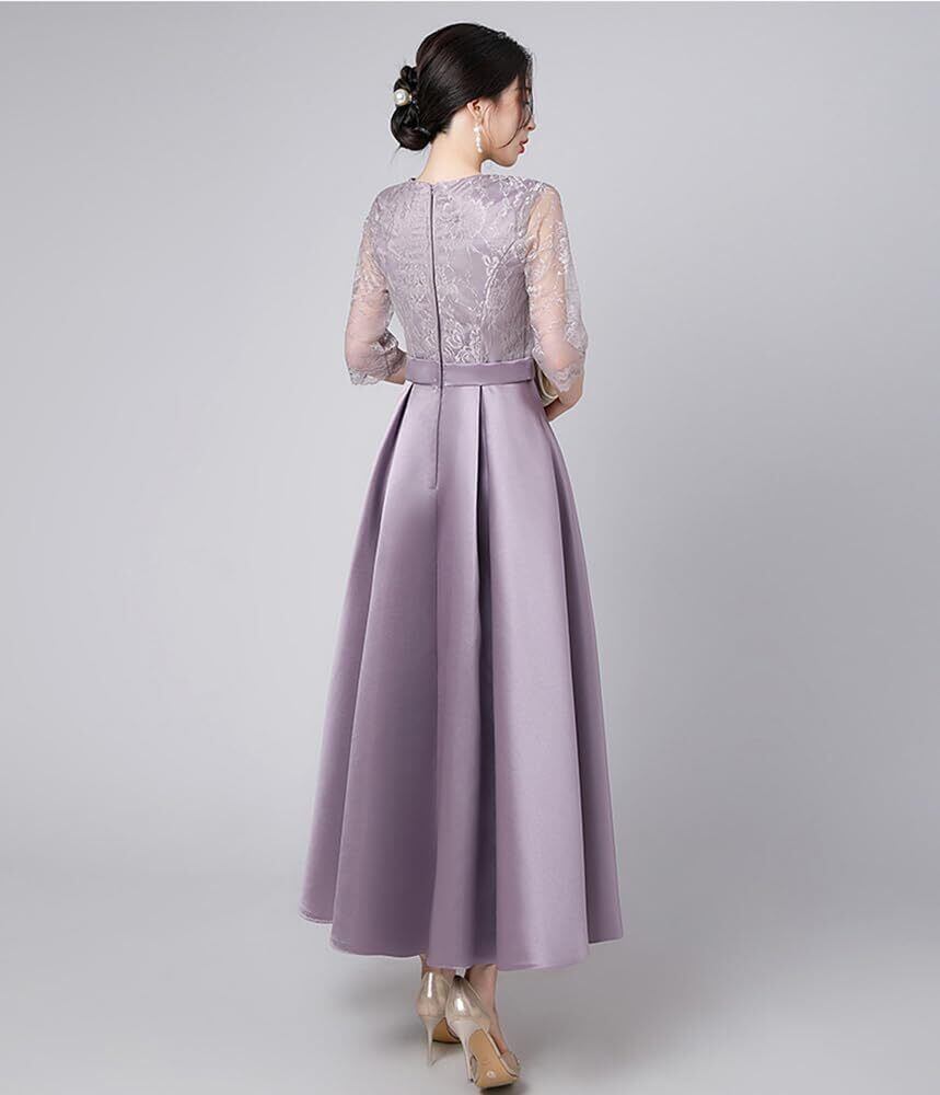 丸首のデザインで、鎖骨が見えます。ネックレスと合わせれば、首のラインがきれいになります。レースに包まれた上半身が高級そうです。背中には見えないジッパーのデザインを採用し、ウエストを際立たせることができます。程よい長さで、すそがすっと垂れ下がっています。ハイヒールと合わせればとても上品です。