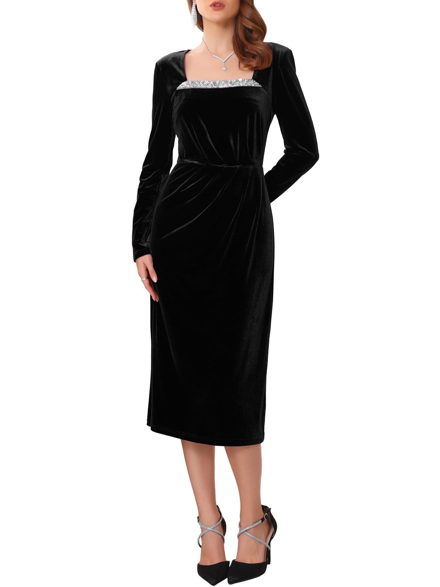 【人気商品】[WOMLAYOUT] レディース ベルベット ルーシュドレス スクエアネック 長袖 フォーマル イブニング ミディドレス
