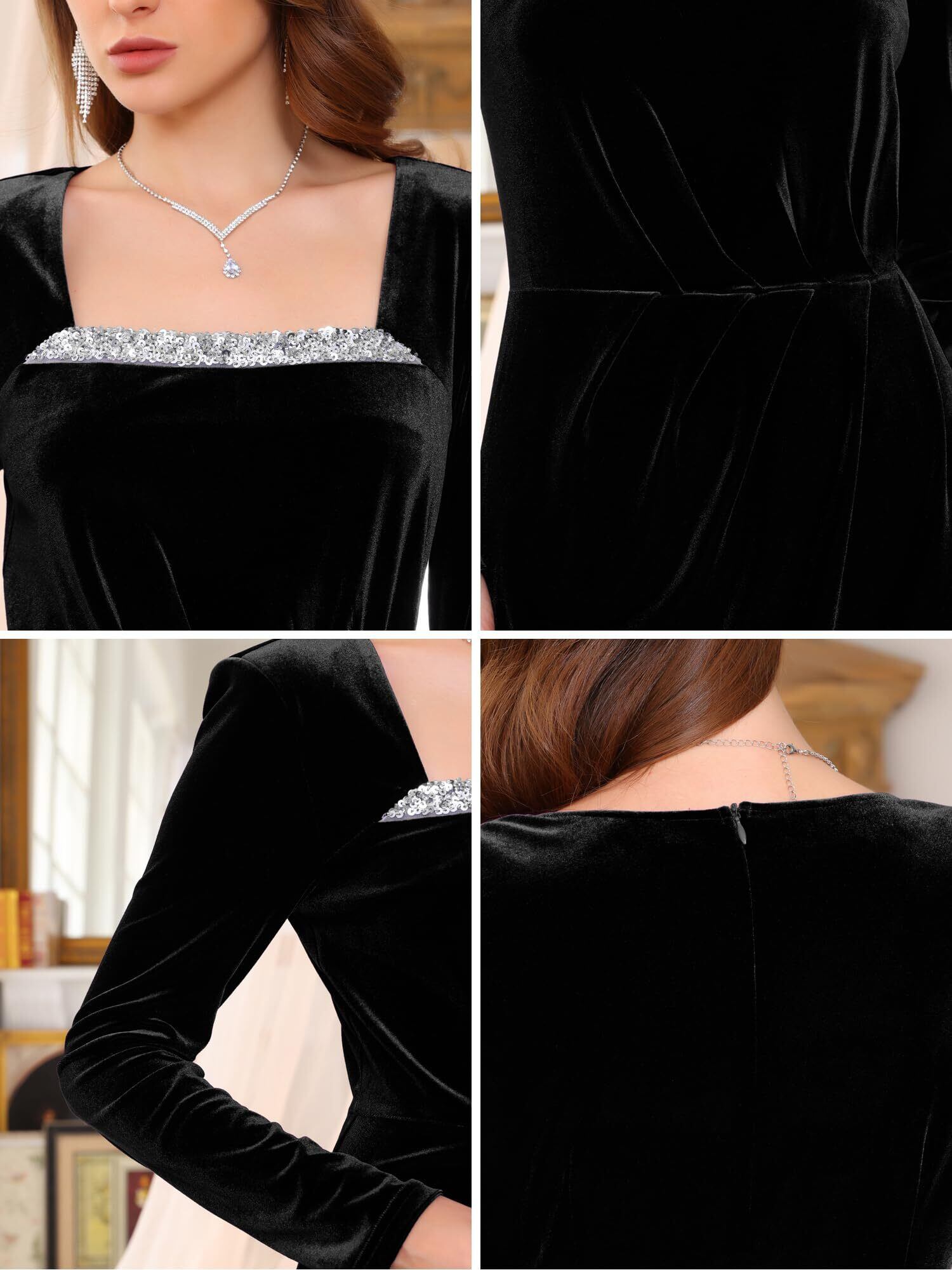[WOMLAYOUT] レディース ベルベット ルーシュドレス スクエアネック 長袖 フォーマル イブニング ミディドレス