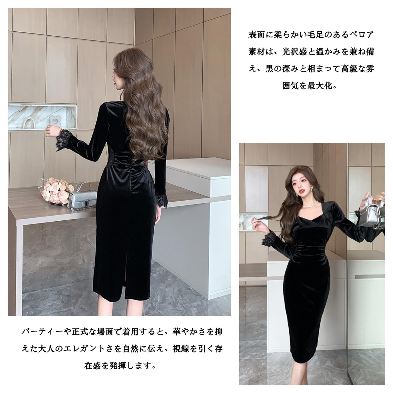 [KSLAT] ベロアワンピース ロング タイトワンピース レディース 袖レース スリット入り イブニングドレス ベルベット 黒 長袖 膝下丈 vネック スリム きれいめ エレガント 結婚式 秋 冬