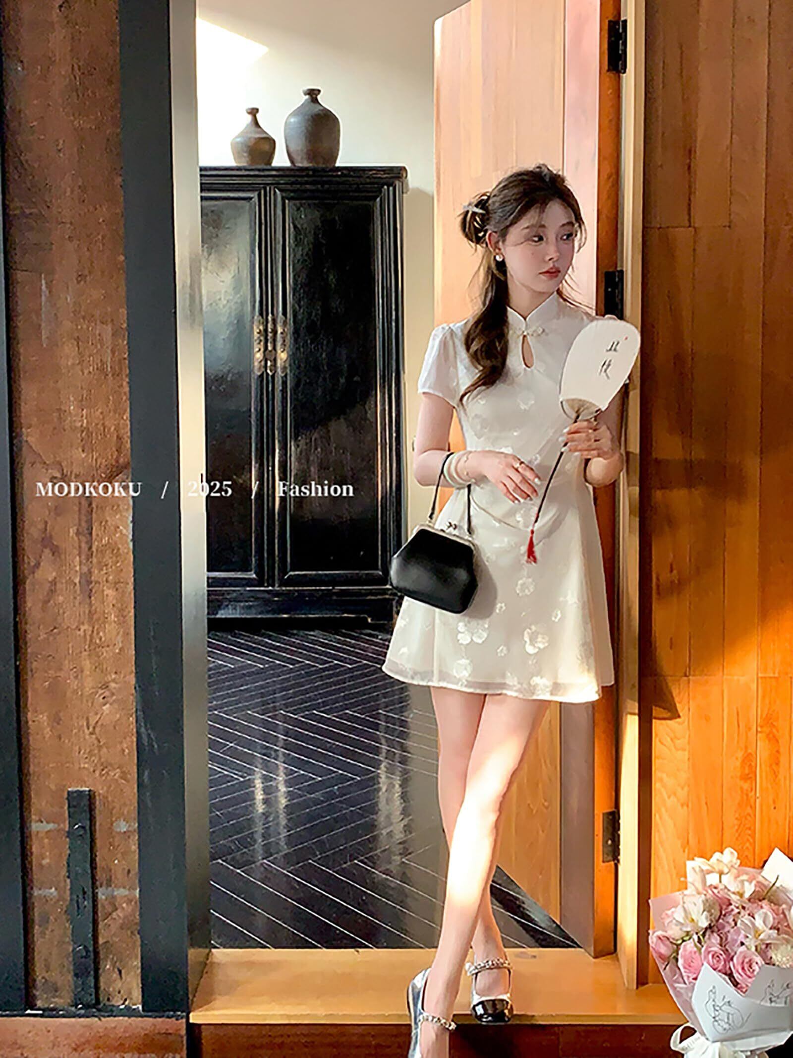 [MODKOKU] チャイナドレス ワンピース レディース チャイナボタン 花柄 刺繍 Aライン 大人 結婚式 女性らしい エレガント フレンチ 森ガール 着痩せ 立ち襟 シフォン ハイウエスト きれいめ 甘い セクシー 女子会 半袖 春 夏 服