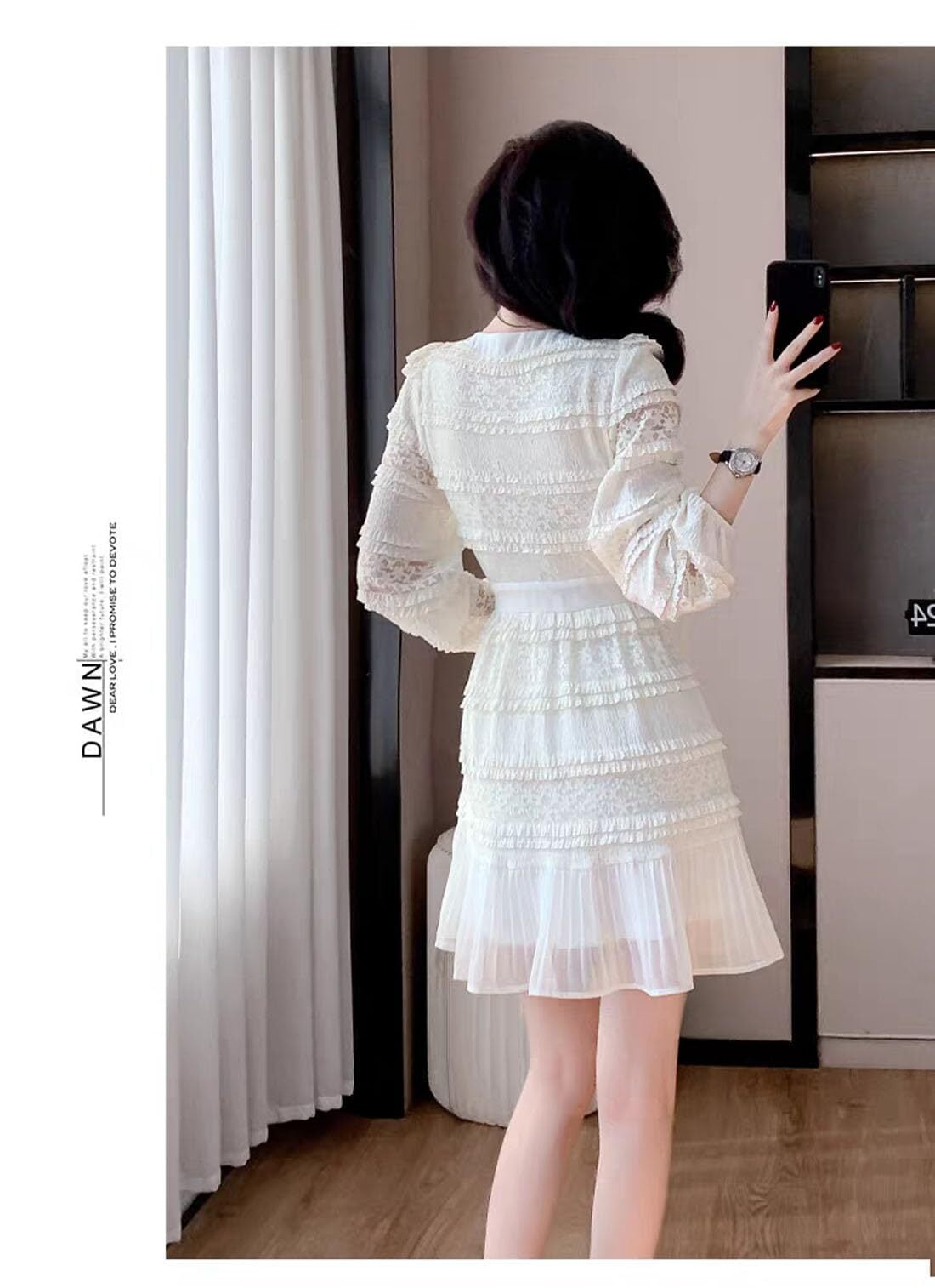 レース細工の透け感が優しい雰囲気に、上品な印象を演出する;袖丈は長袖、透け感の美しいレース袖は腕の気になる部分を隠してくれます。高めのウエストベルト切り替えで、脚長シルエットが完成します;ロング丈でも重たさを感じさせない、裾のレースがポイントです。