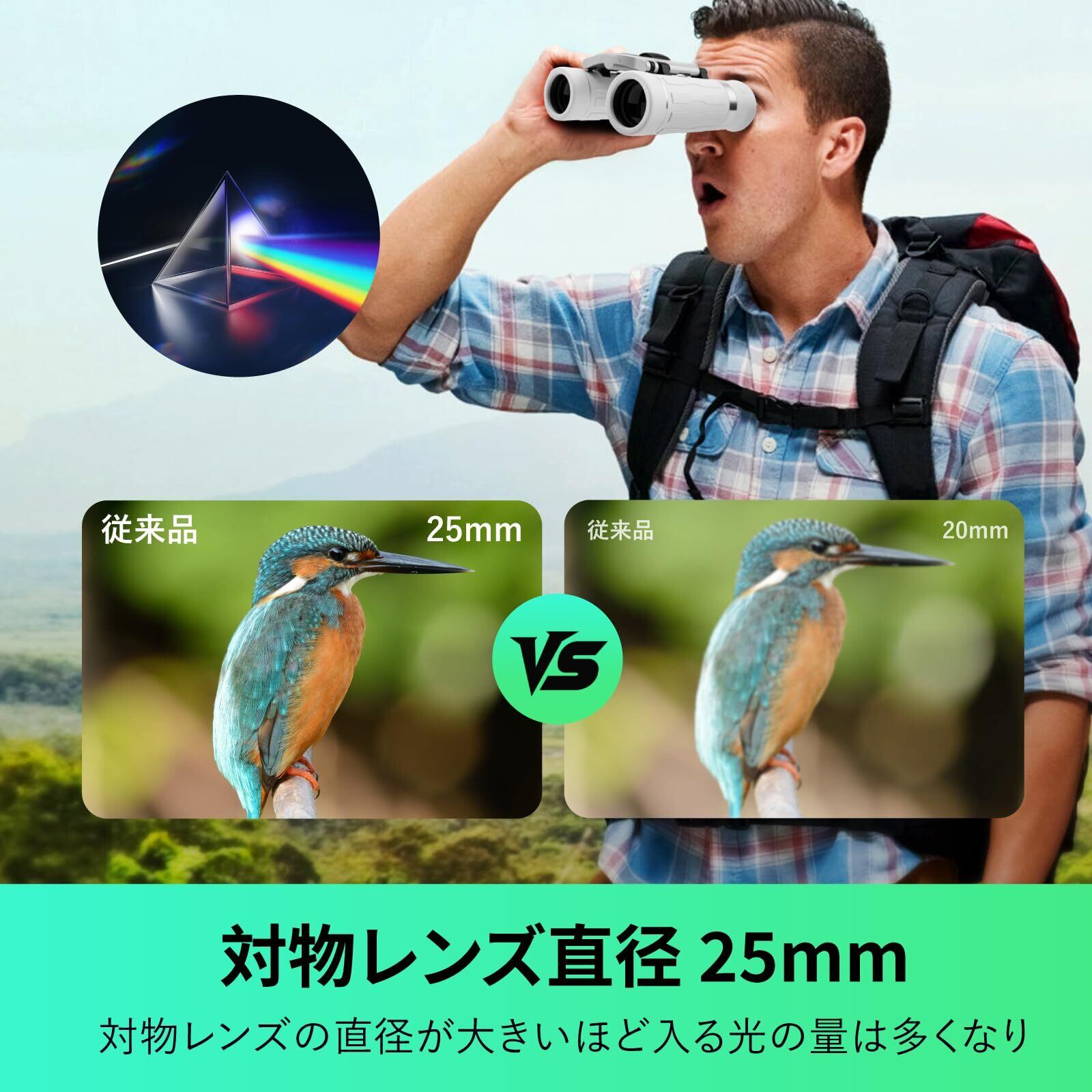 【業界最高水準の光学性能を実現】最新の20倍超高倍率双眼鏡は、6.5°の超広視野を誇り、500m先の人を裸眼で10m先で見るように鮮明に捉えます。BAK4プリズムとFMC多層コーティングを採用し、光透過率99.8%を達成。業界最先端の光学技術により、反射を抑え、より鮮明な視界を提供します。高倍率双眼鏡をお探しの方や、コンサート、スポーツ観戦、野鳥観察などに最適です。薄暗い環境でも良好な視界を確保し、臨場感あふれる明るい視界を楽しめます。