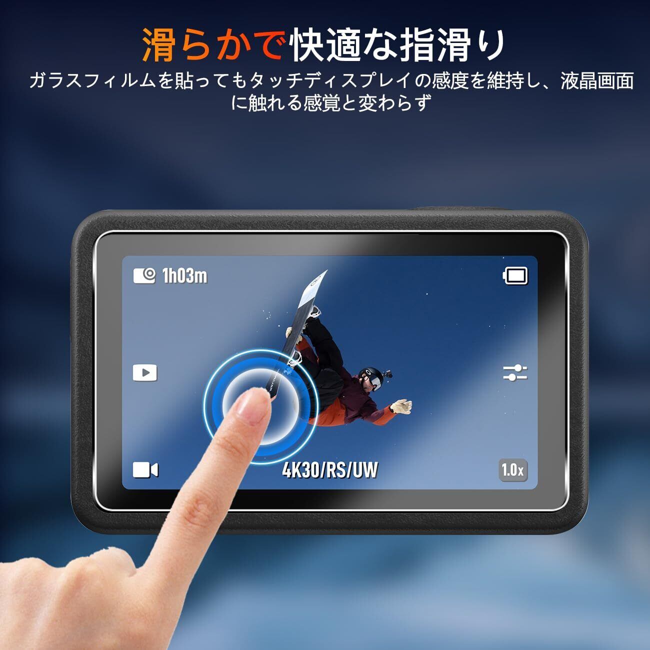 【超高品質&超薄型素材】この液晶画面用ガラスフィルムは DJI Osmo Action 5 pro に対応。超薄型0.26mmの素材なので、液晶画面をタップする際にフィルムなしの場合よりもスムーズにスマホを操作できます。