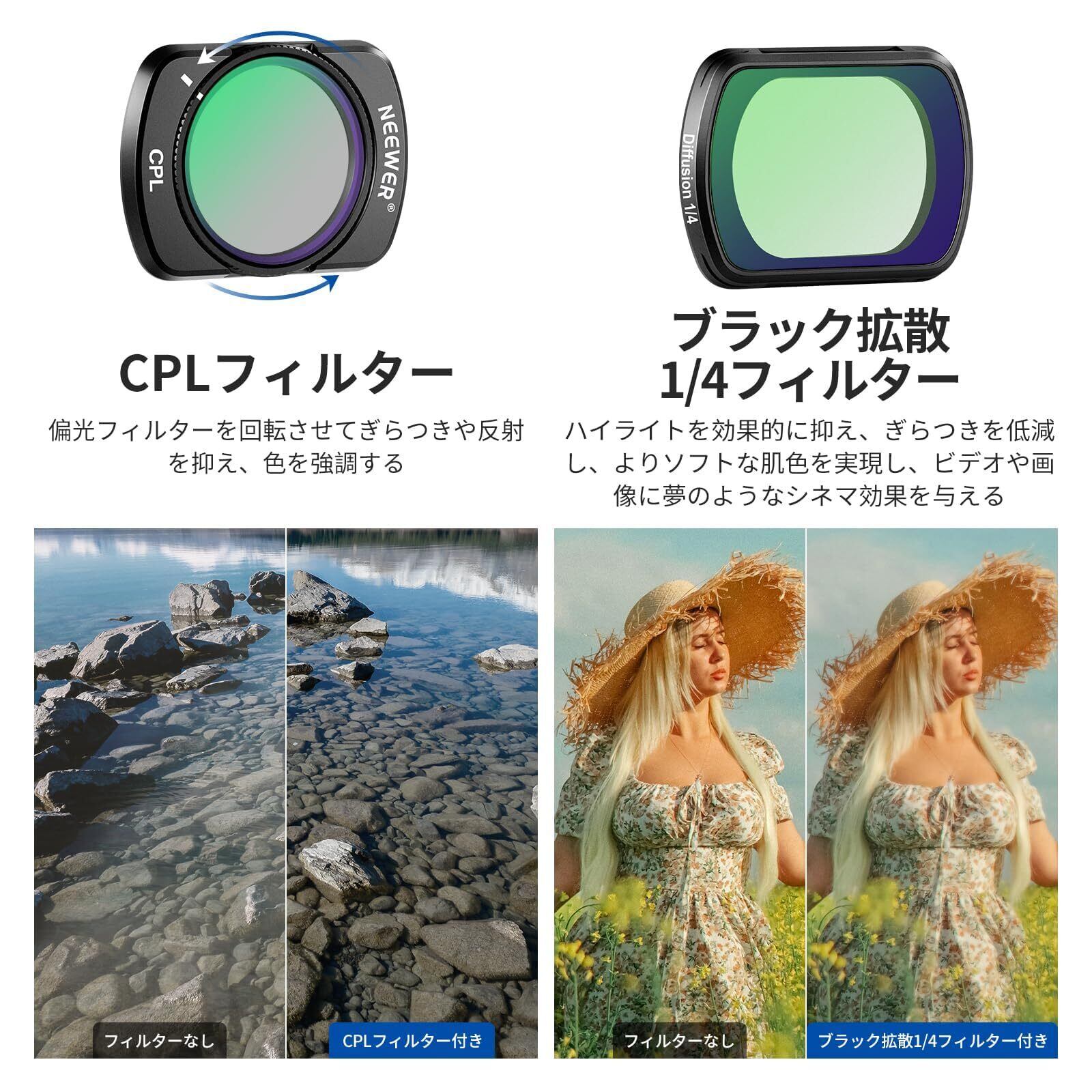 NEEWER ND2-32&1/4ブラック拡散&CPLフィルター コンパチブル Osmo Pocket3 磁気 強化ガラスフィルム2枚付き HD光学ガラス 減光フィルター 映画効果レンズフィルター 偏光フィルター レンズフィルター アクションカメラレンズフィルター