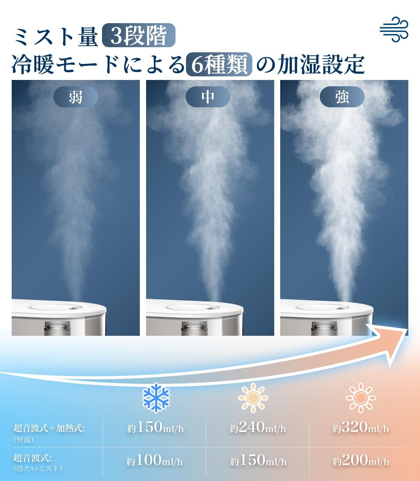 ️【2025新モデル|冷温2WAYのハイブリッド加湿器】超音波式と加熱式の組み合わせにより、加湿器は温かいミストも出せます。5μm以下の微細なミスト粒子がほこりを素早く沈殿させ、デスクや床を濡らす心配がありません。"ミスト量"を3秒間長押しすると、加熱機能がオンになり、最高温度は50度まで上がり、恒温加湿、効果的な除菌だけでなく、室温調整、空気浄化、肌の乾燥、花粉症や季節性鼻炎などの症状の改善にも役立ちます。※加熱モードをオンにしてから約3分後に温かいミストが出始め、約15分後に最高温度に達します。加熱モードをオフにしてから約30分後に冷たいミストに切り替わります 。