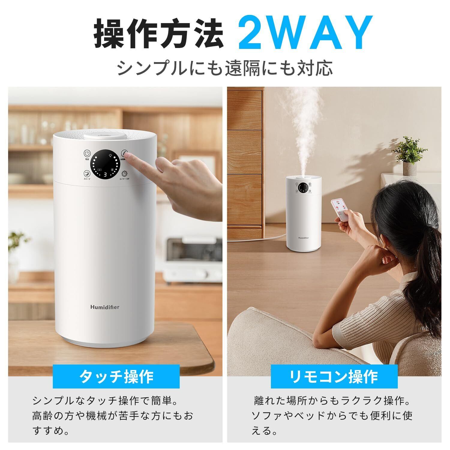 【 スマート&安全機能:リモコン操作で快適コントロール】ベッドやソファから動かず操作できるリモコン操作に対応。タッチパネルに加え、離れた場所からでも快適に加湿レベルを調整できます。水がなくなると自動で停止・警告する空焚き防止機能付きで、就寝中や外出時の不安を解消します。オフタイマーや3段階調整など、お好みに合わせてカスタマイズ可能です。