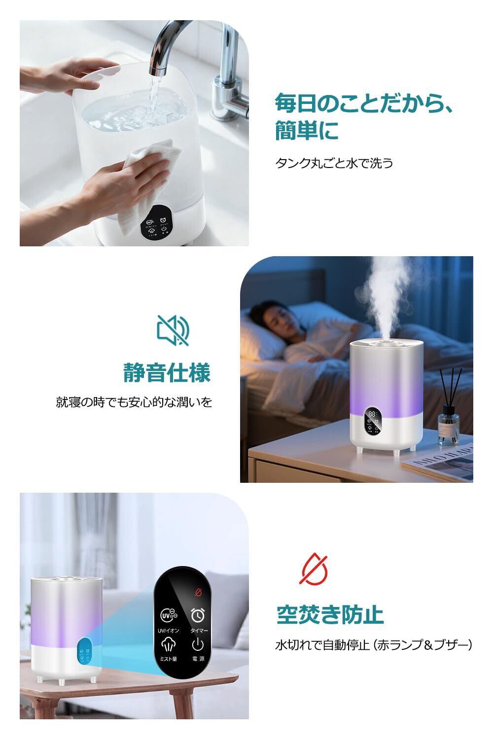 【新着商品】加湿器 大容量 4.5L 【2025冬新モデル・UVライト除菌・上から給水】 超音波式加湿器 卓上 アロマ対応 マイナスイオン機能搭載 ダブル噴霧口 6段階ミスト調整 4段階タイマー 静音設計 55時間連続運転 360°回転ノズル 空焚き防止 タッチパネル&リモコン付き 水漏れ防止 花粉&乾燥対策 次亜塩素酸水対応 加湿機 リビング・オフィス・家庭用・業務用