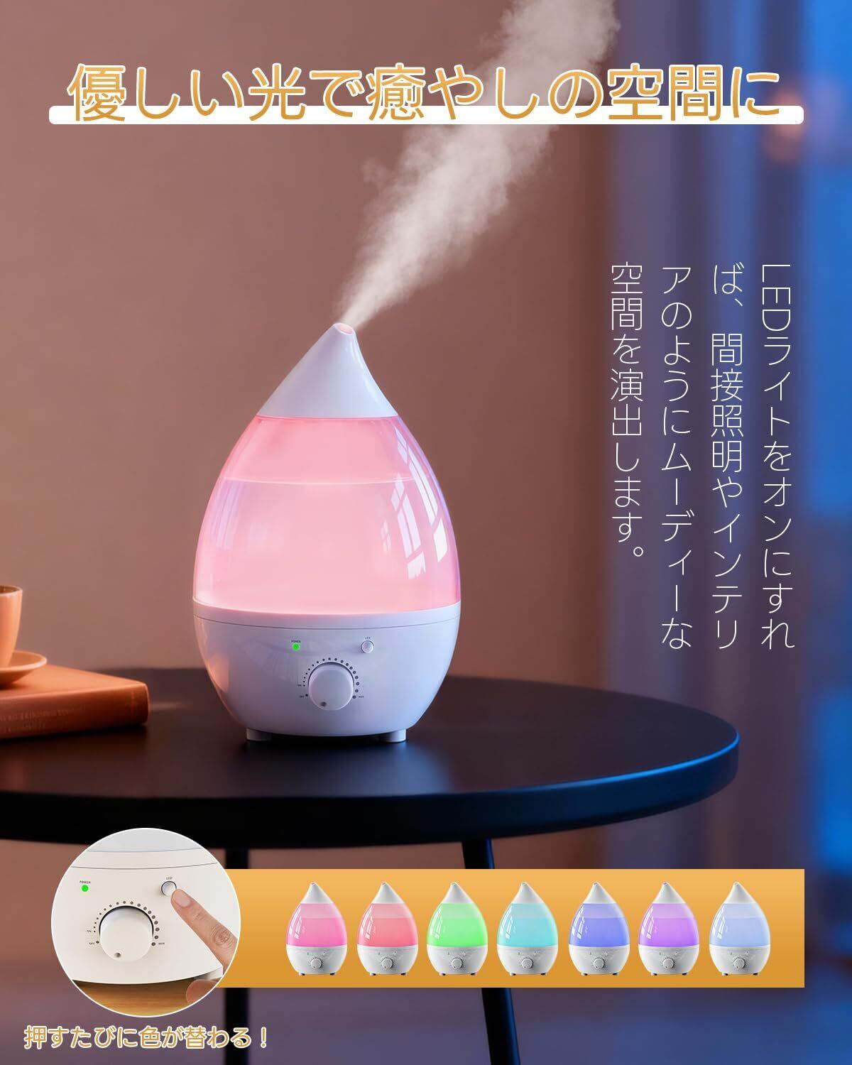 卓上 小型 加湿器【水滴型・2025年新モデル】超音波式 無段階加湿量調節 1.8L大容量 最大加湿量120ml/h 35dB静音 カラフルLEDライト搭載 7〜12時間連続加湿 アロマ対応 空焚き防止 操作簡単 省エネ お手入れ簡単 寝室/オフィス/リビング対応 乾燥/花粉症対策(ホワイト)