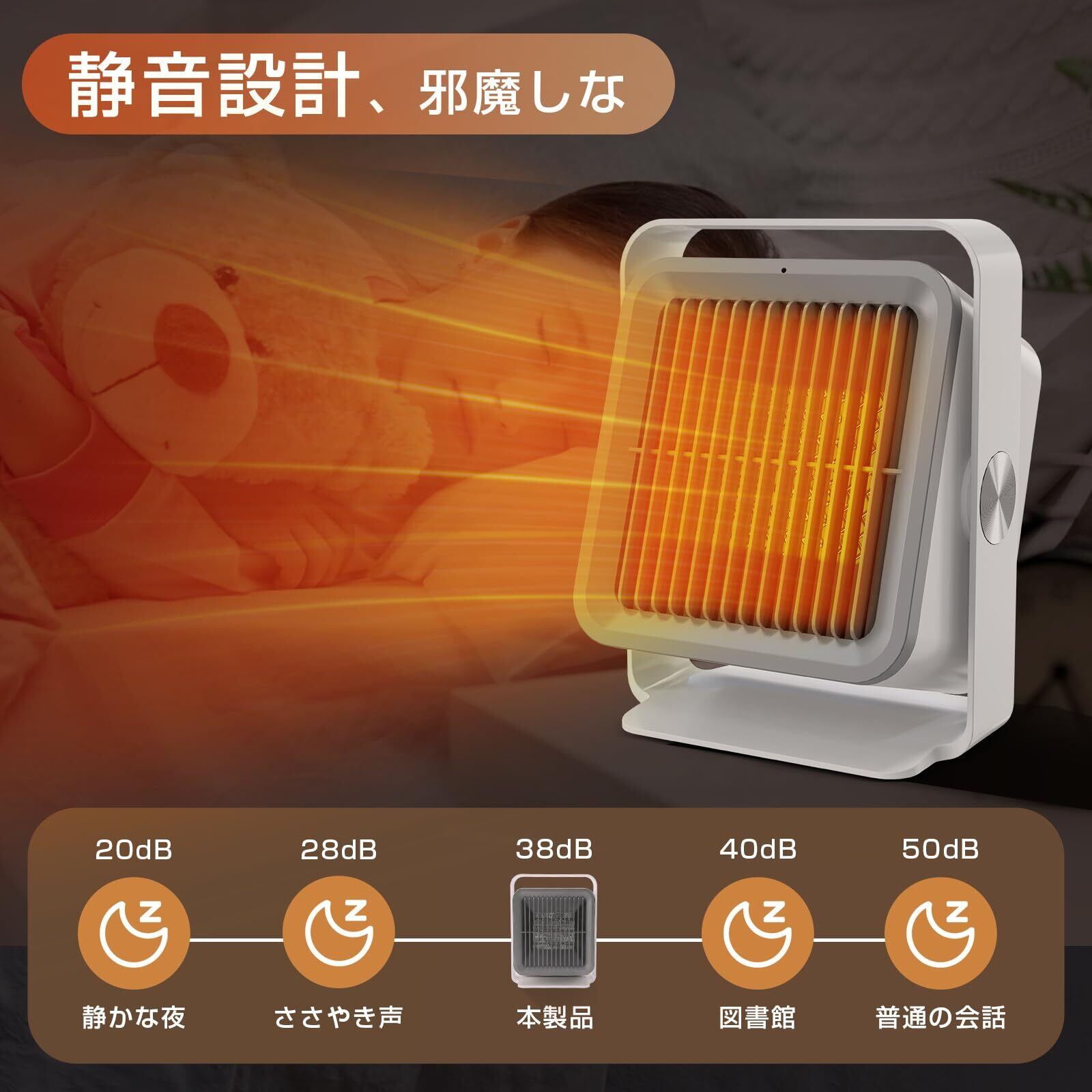 【静音運転・送風角度調整可】電気ストーブの運転音はわずか38dB、動作音がほとんどないため、睡眠や勉強、仕事の邪魔になりません。手動で送風角度を調整でき、使用シーンやニーズに応じて風向きを変えることで、さまざまな状況に対応できます。