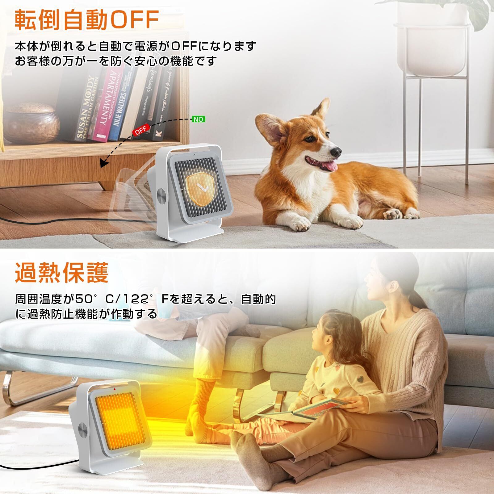 当ヒーターには、転倒自動OFF機能と過熱防止機能が備わっており、小さなお子様やペットがいる家庭でも安心してご使用いただけます。安全に配慮した設計で、快適なヒーターライフを実現します。