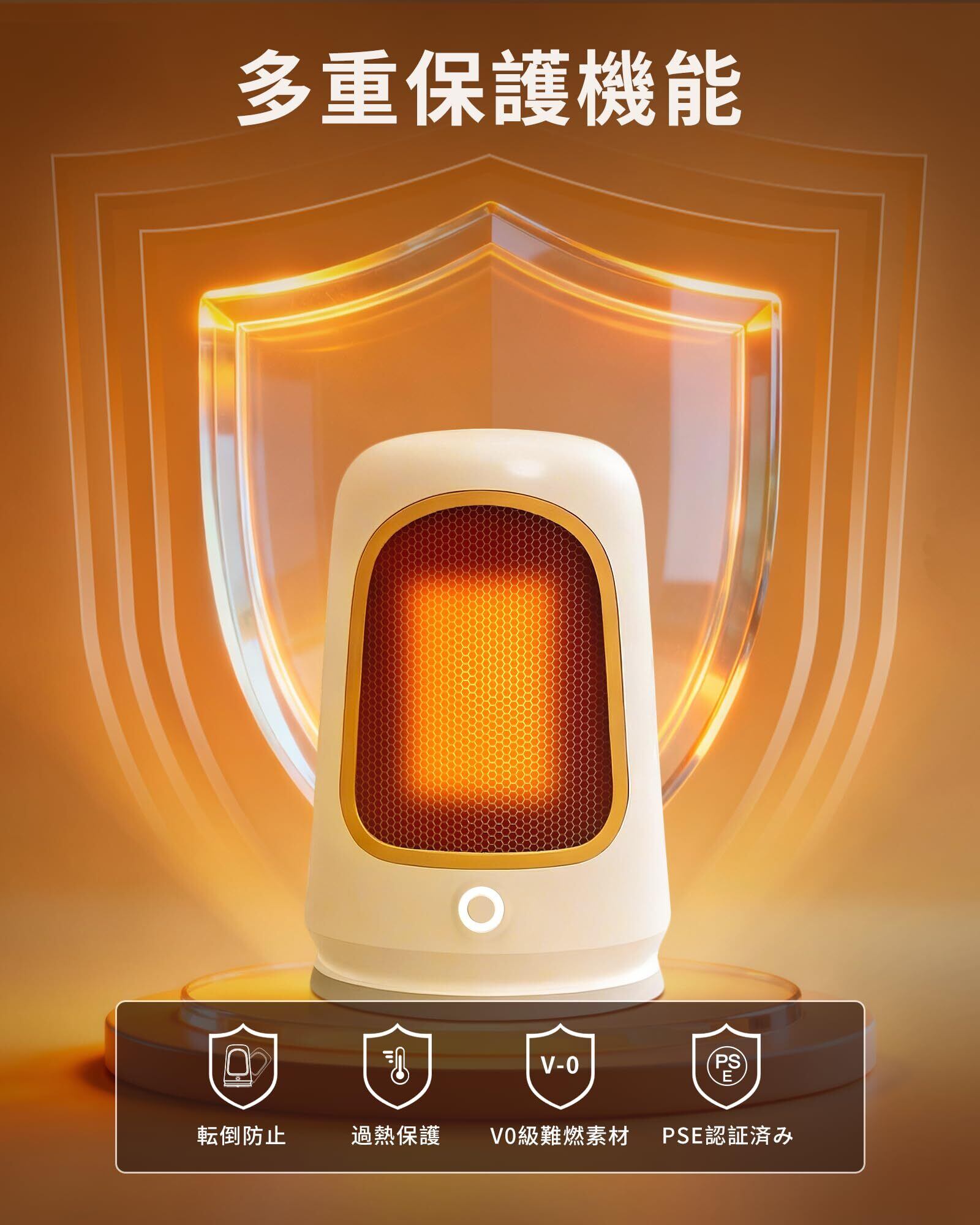 特徴 2秒速暖、調整可能な風量、転倒防止機能、軽量、過熱防止機能,、難燃性