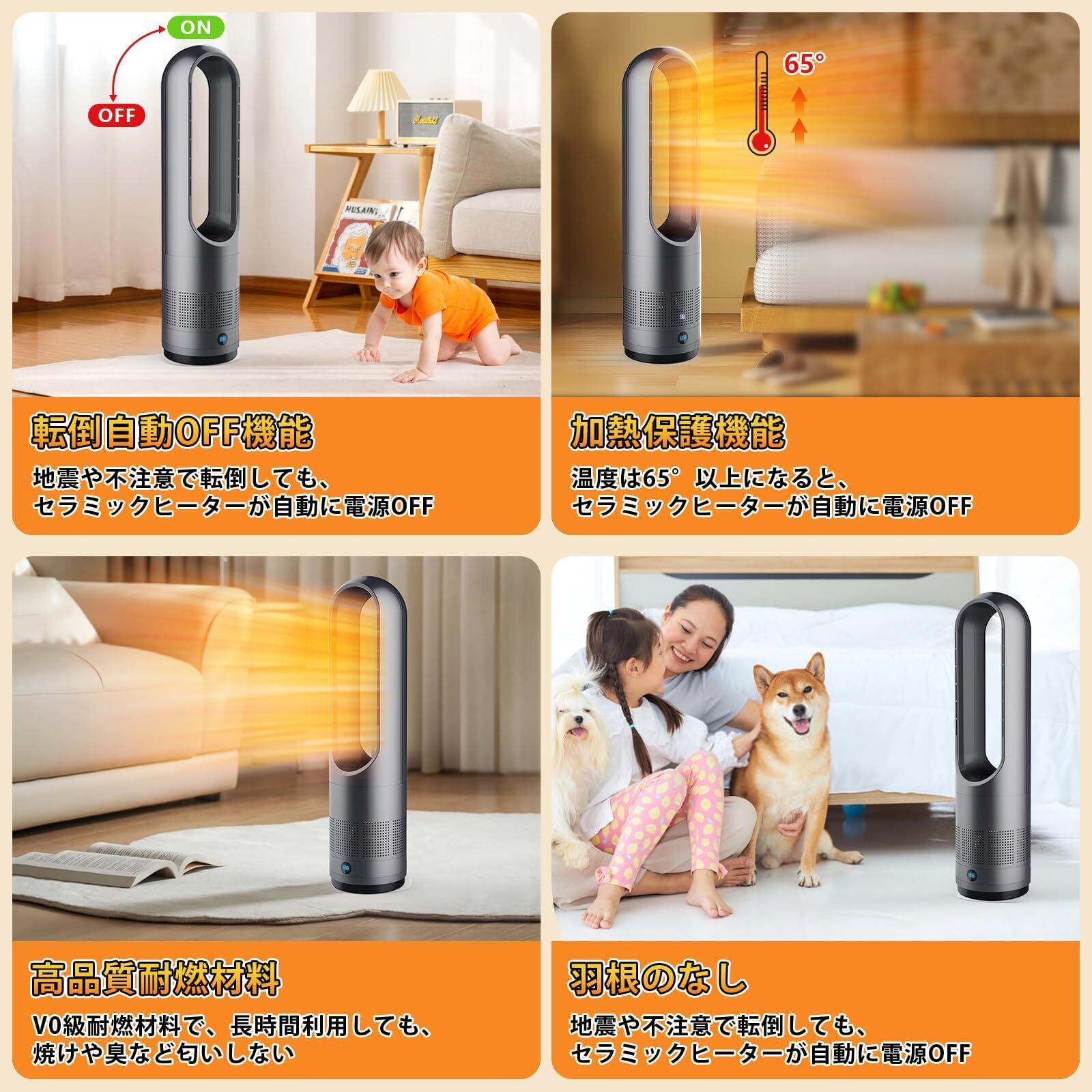 セラミックヒーター タワーファン ファンヒーター スリム扇風機【冷暖両用&羽根なし&DCモーター電気代節約】電気ファンヒーター 3段階暖風・8段階冷風切り替え 100°左右首振り 1-9Hタイマー設定可 転倒自動OFF 過熱保護 リモコン付き 省エネ 軽量 持ち運び便利 部屋 洗面所 脱衣所適用 夏冬兼用 寒さと熱中症対策 PSE認証済み 日本語取扱説明書 (Gray)