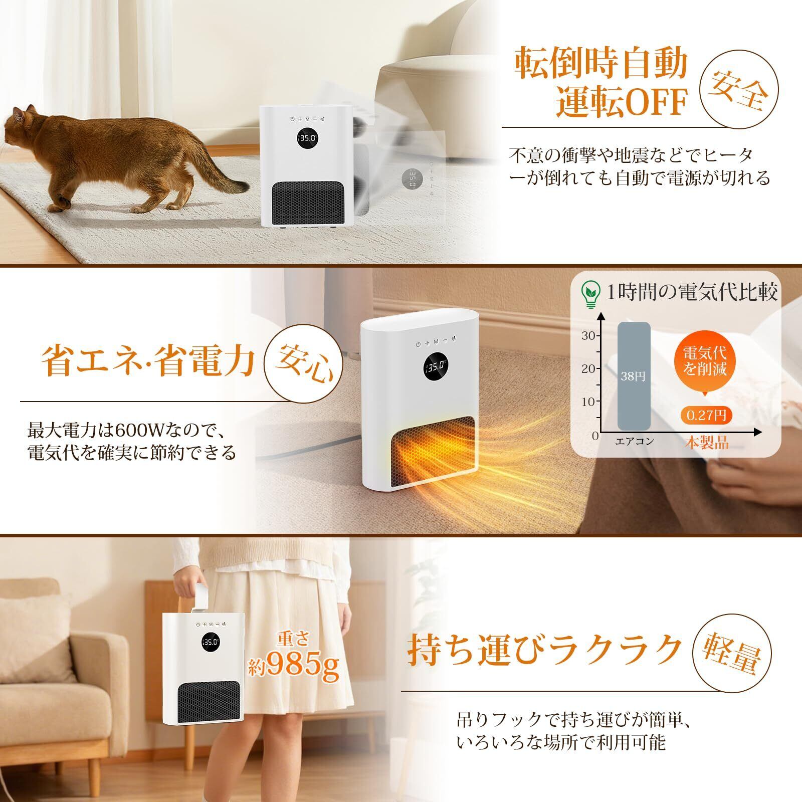 ①壁掛け&吊り上げ&縦置き ②人感センサー ③2段階温風調節 ④速暖&大風量 ⑤ECO知能恒温 ⑥切り忘れ防止 ⑦1-12hタイマー機能 ⑧メモリー機能 ⑨リ… 表示を増やす